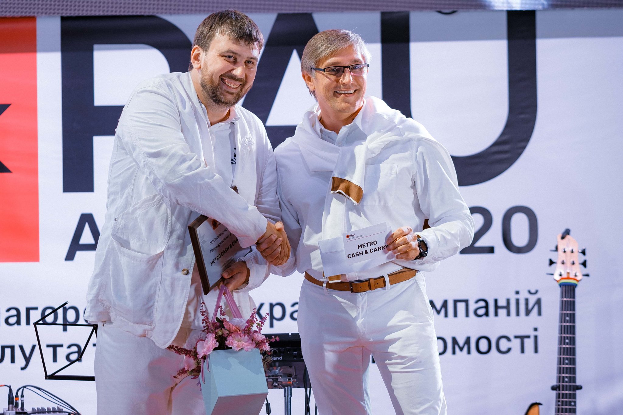 Віце-президент з розвитку Fozzy Group Андрій Шутко отримує нагороду за “Супермаркет року в FMCG”. Переможця вітає керуючий партнер юридичної компанії Ader Haber Юрій Петренко.