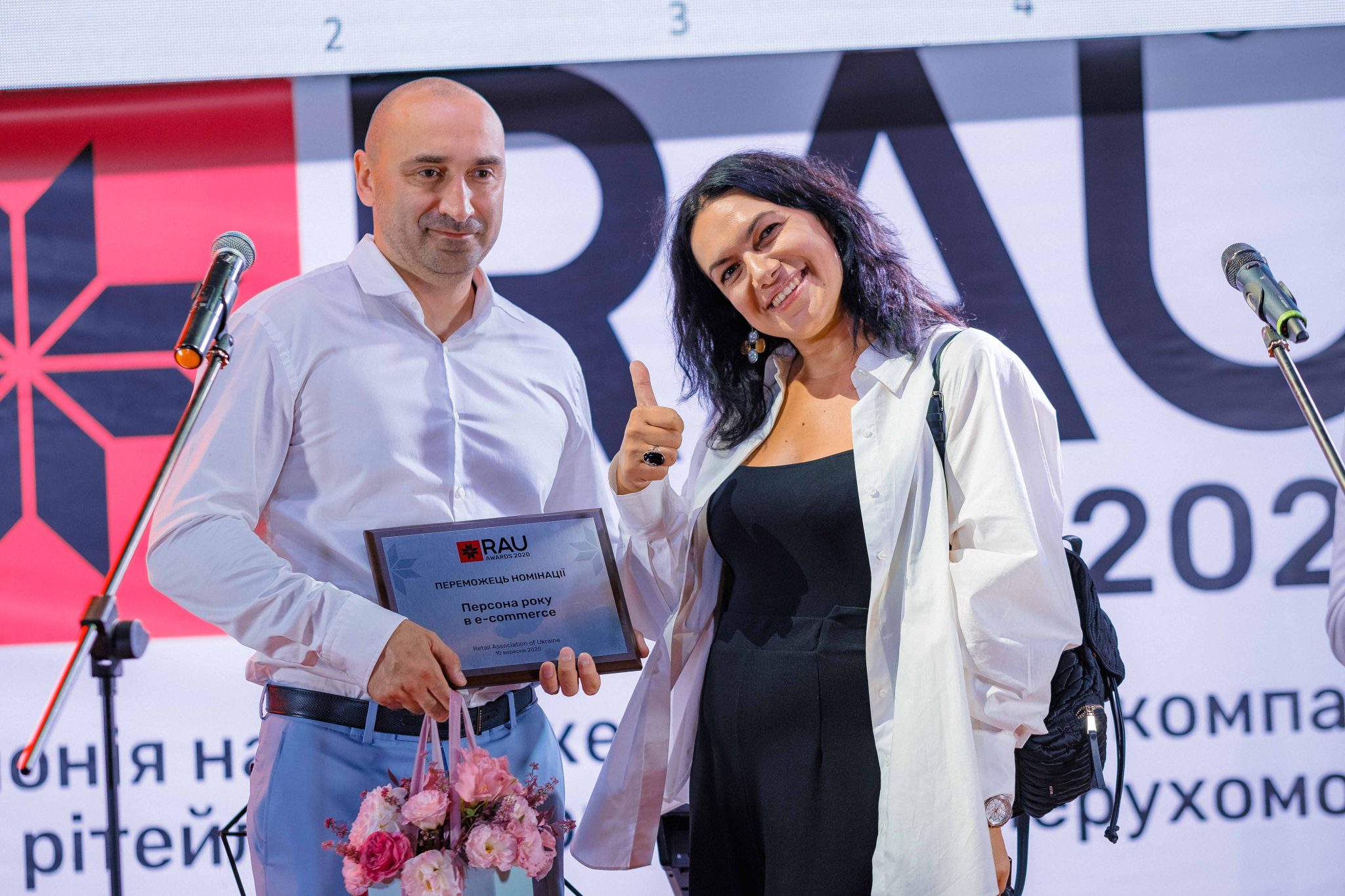 Маркетинг менеджер Rozetka Олена Распутна забирає нагороду “Персона року в e-commerce” для Владислава Чечоткіна з рук Максима Гаврюшина (Budhouse Group).