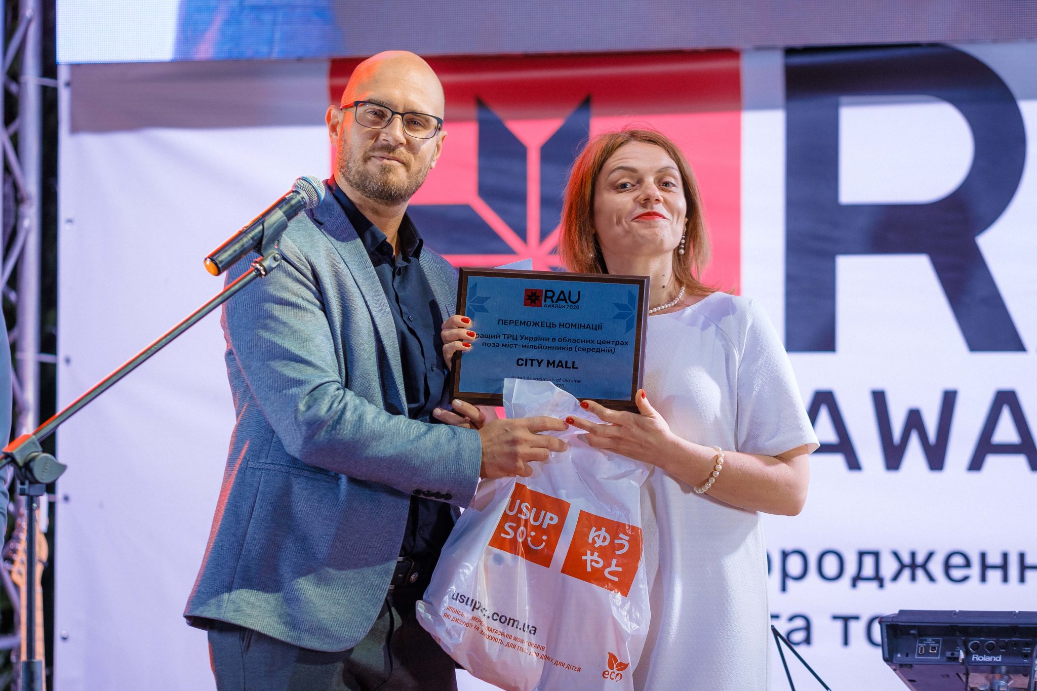 ТРЦ City Mall переміг як “Кращий середній ТРЦ поза міст-мільйонників” із GLA від 20 000 кв. м до 39 999 кв. м. Нагороду отримує директор з комунікацій Arricano Олена Обухівська.