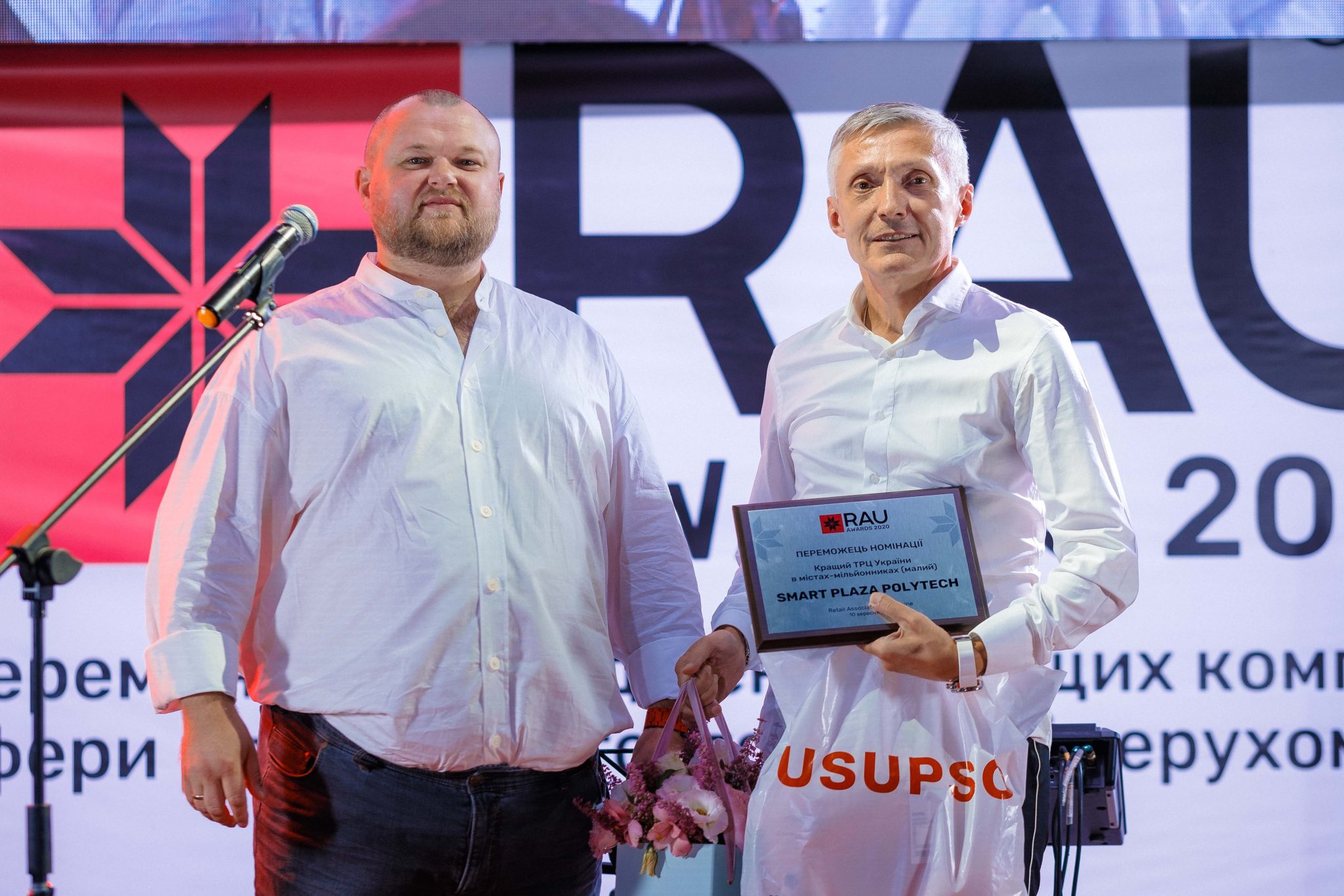 Співзасновник і співвласник VOVK Віталій Семенченко вручає нагороду переможцю в номінації “Кращий малий ТРЦ в містах-мільйонниках” – ТРЦ Smart Plaza Polytech.