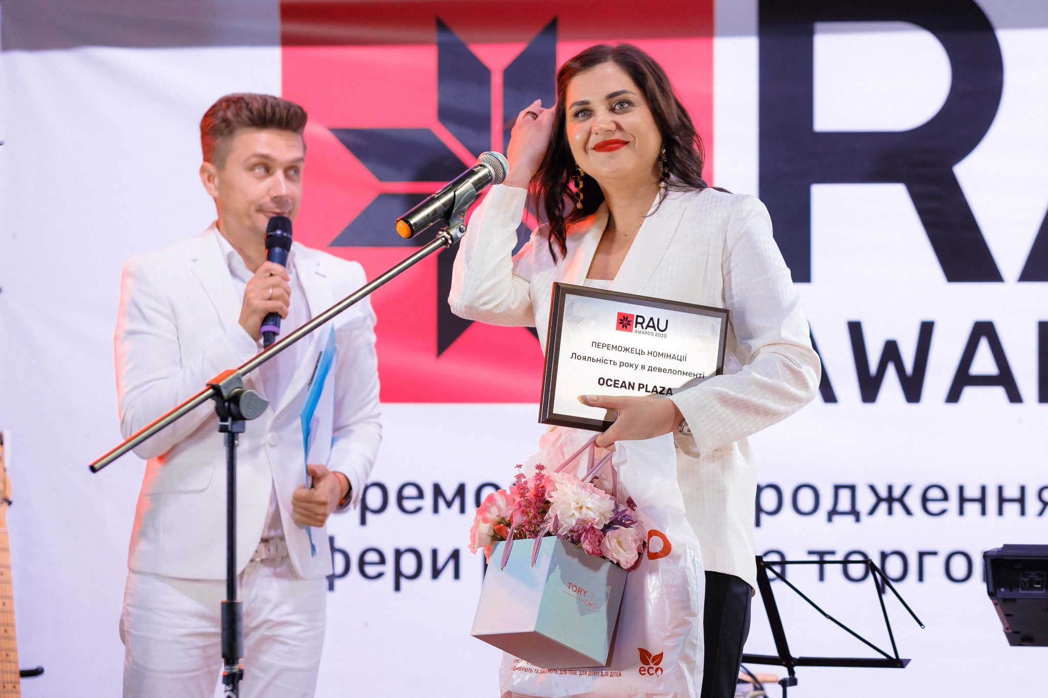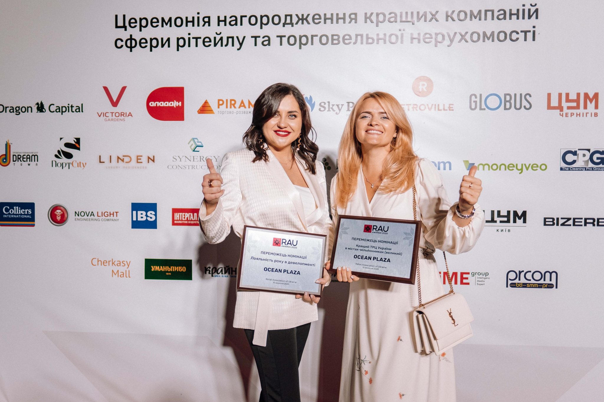 ТРЦ Ocean Plaza – триумфатори вечора. Комерційний директор Ocean Plaza Дар’я Завадська двічі виходила на сцену, щоб отримати дипломи за перемогу в номінаціях “Лояльність року в девелопменті” та “Кращий великий ТРЦ в містах-мільйонниках”.
