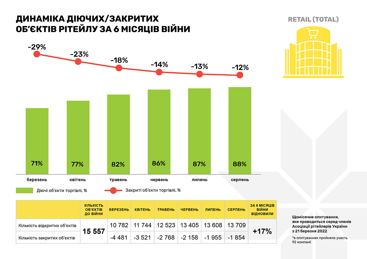 Завдяки успіхам ЗСУ у наступні місяці мережі змогли все активніше відновлювати роботу своїх магазинів. І вже в серпні у порівнянні з лютим не працювало всього 12% магазинів: за півроку війни кількість закритих об’єктів знизилася більш ніж вдвічі.