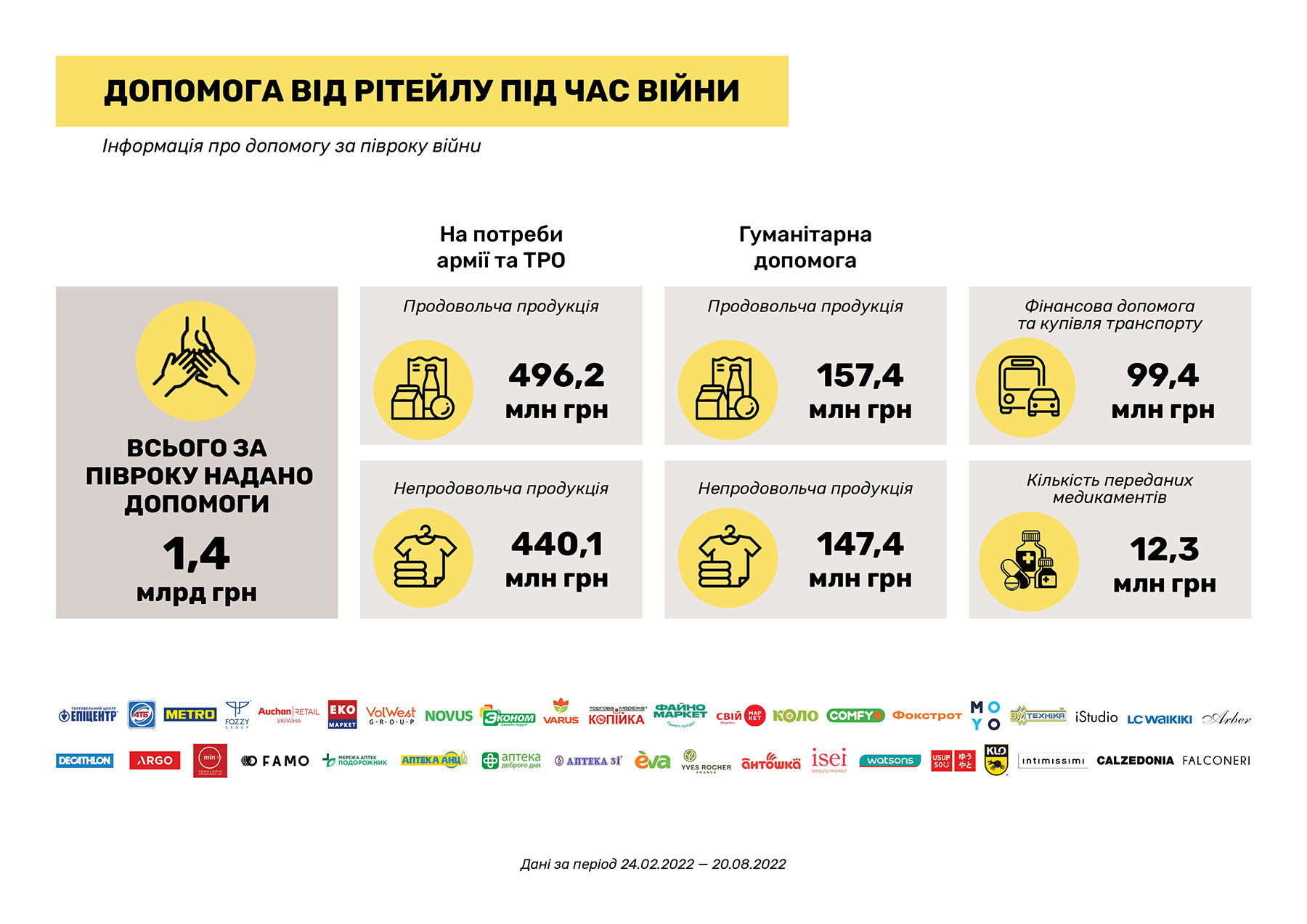 Станом на початок вересня загальна сума гуманітарної допомоги, яку надали компанії-члени RAU, перевищила 1,4 млрд грн. І кожного дня кожна мережа продовжує допомагати армії, біженцям, гуманітарним організаціям, підтримувати ЗСУ й таким чином наближати перемогу.