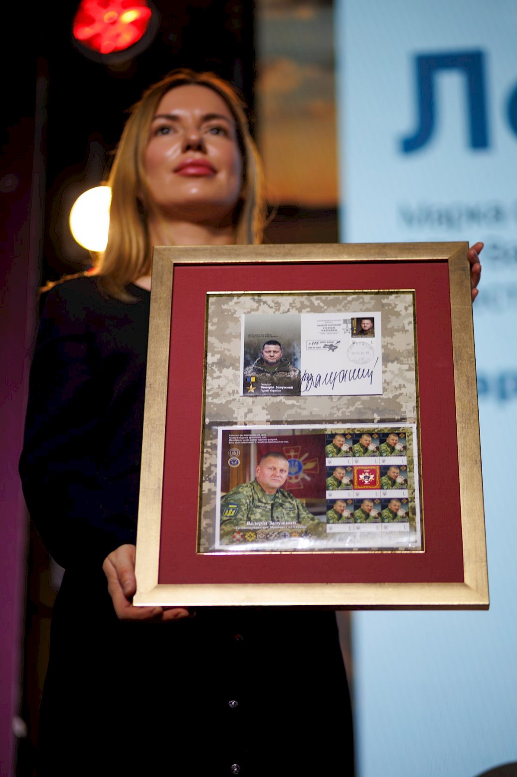 А тепер переходимо до благодійного аукціону від проєкту «Пташки пермоги». Перший лот – марка, створена у співавторстві з Головнокомандувачем ЗСУ Валерієм Залужним. У лот також входить конверт «Хрест бойових заслуг» з підписом генерала.