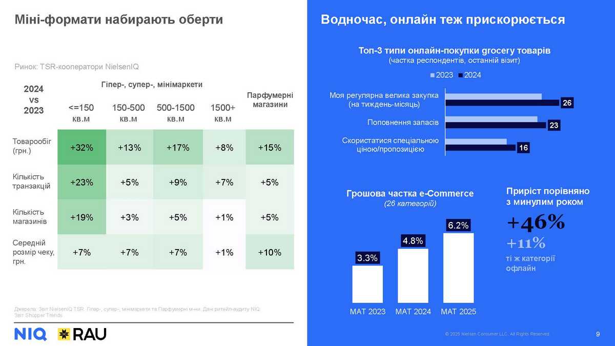 У товарообігу українського FMCG збільшується частка мінімаркетів площею до 150 кв. м, які зросли за рахунок розширення кількості магазинів на +19% у 2024-му порівняно з 2023-м. При цьому гіпермаркети площею понад 1500 кв. м показали найповільніше зростання серед форматів каналу гіпер-,супер-,мінімаркети за показниками товарообігу, кількості магазинів та середнього чеку. Найбільше зростання середнього чеку при цьому показують парфумерні магазини. Онлайн-торгівля – канал, який наразі демонструє найшвидше зростання як в Україні, так і у Європі. Якщо раніше ми бачили фокус зростання онлайн-продажів на певний перелік категорій, таких як міцний алкоголь, кава, дитяча гігієна та харчування та габаритні товари, то зараз найпопулярнішими місіями відвідування таких сайтів є велика основна закупка на тиждень-місяць та поповнення запасів. А це, у свою чергу, є прямою загрозою (або можливістю) перетікання попиту з фізичного ритейлу у електронну комерцію.