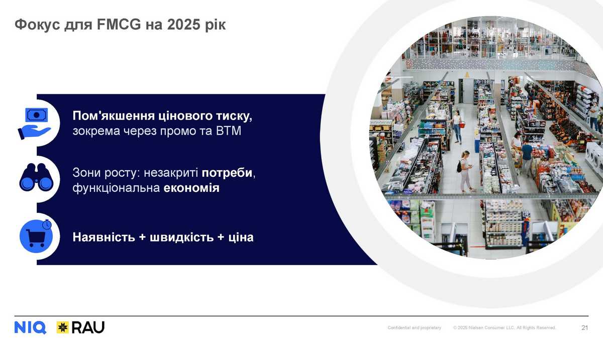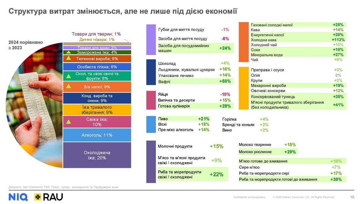 Повномасштабне вторгнення безпосередньо вплинуло на ринок FMCG, особливо за рахунок скорочення населення. На даних мереж кооператорів NielsenIQ ми досі бачимо суттєве відставання ринку: -16% упаковок у календарному 2024-му порівняно з 2021-м. Однак, український ринок усе ж показує певну позитивну динаміку, яка забезпечується передусім продовольчими категоріями. Серед факторів, що підтримують позитивну динаміку продажів: