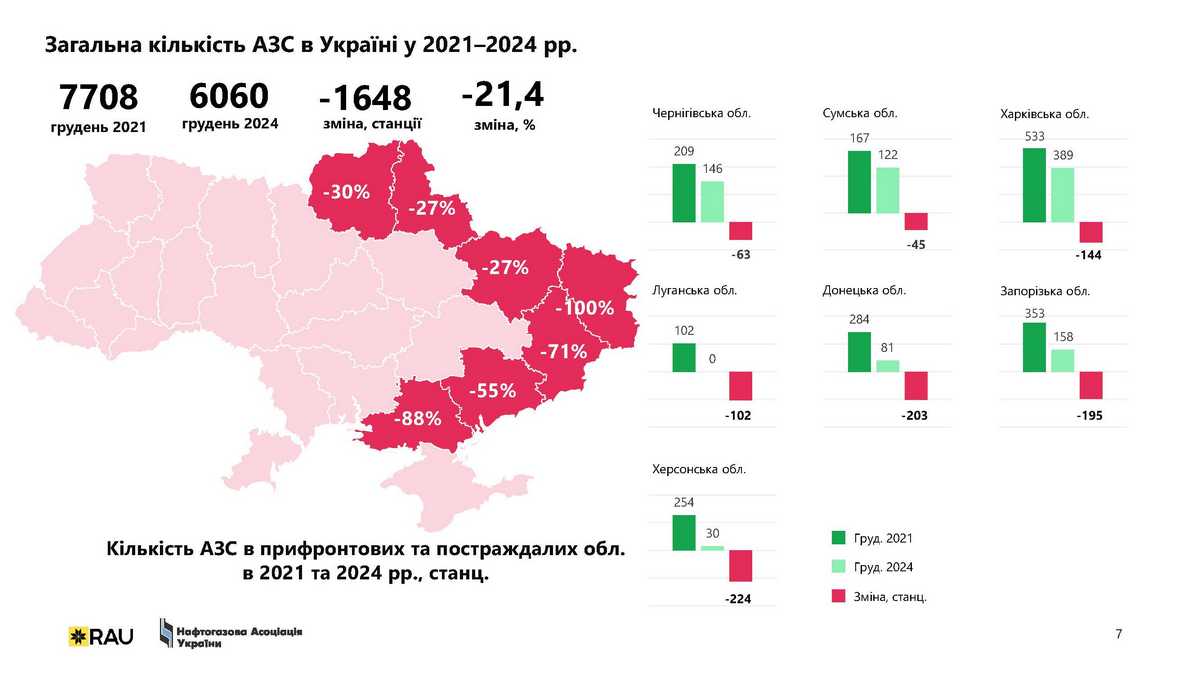 Станом на грудень 2021 року в Україні було майже 7700 АЗС, натомість вже в грудні 2024-го їх було трошки більше 6000. Основний чинник – бойові дії. На слайді відображено динаміку кількості АЗС в прифронтових та окупованих регіонах за період 2021-24 роках. Ще одним чинником, який, на нашу думку, вплинув на кількість АЗС – запровадження авансової сплати податку на прибуток з АЗС. Про це поговоримо трошки пізніше.