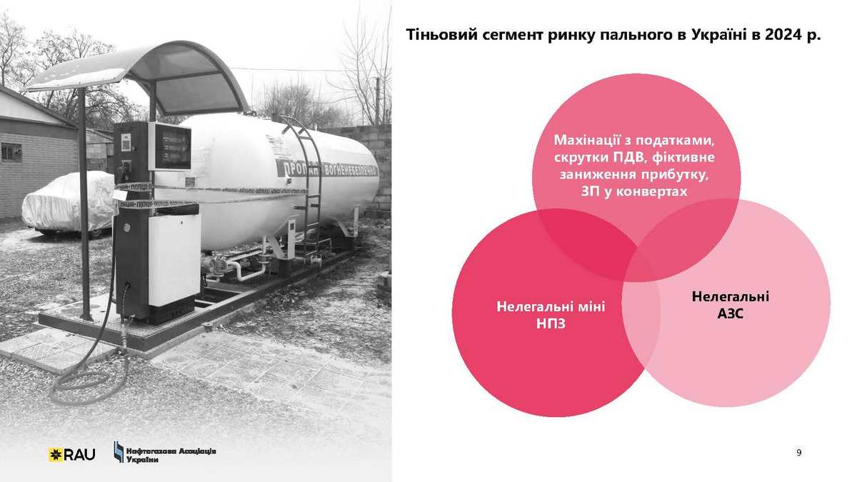 Традиційно, коли ми говоримо про тінь на ринку нафтопродуктів, ми говоримо про три складові, які тісно переплетені між собою: махінації з податками (скрутки ПДВ, фіктивне заниження прибутку, ЗП в конвертах); нелегальні АЗС; нелегальне виробництво.