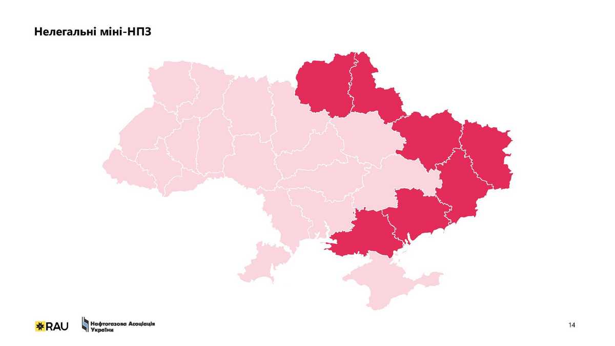 До повномасштабного вторгнення ми відмічали більше 20 об’єктів, на яких було наявне обладнання для перегонки газового конденсату (основна сировина) в нафтопродукти. Як правило таке «некондиційне» пальне вводиться в обіг не як моторне паливо, а в якості різноманітних розчинників або суміші вуглеводнів, а іноді і взагалі реалізується виробниками «за готівку». Потім воно реалізується як через мережі АЗС, так і промисловим споживачам. Це в свою чергу приводить до несплати акцизного податку та ПДВ. Частина таких об’єктів була відпрацьована правоохоронцями, частина знищена ударами агресора. Тому тут на слайді не буде ні адрес, ні приблизних локацій. Станом на зараз працює близько п’яти підприємств, обсяг продукції яких можна оцінити в 5-10% ринку.
