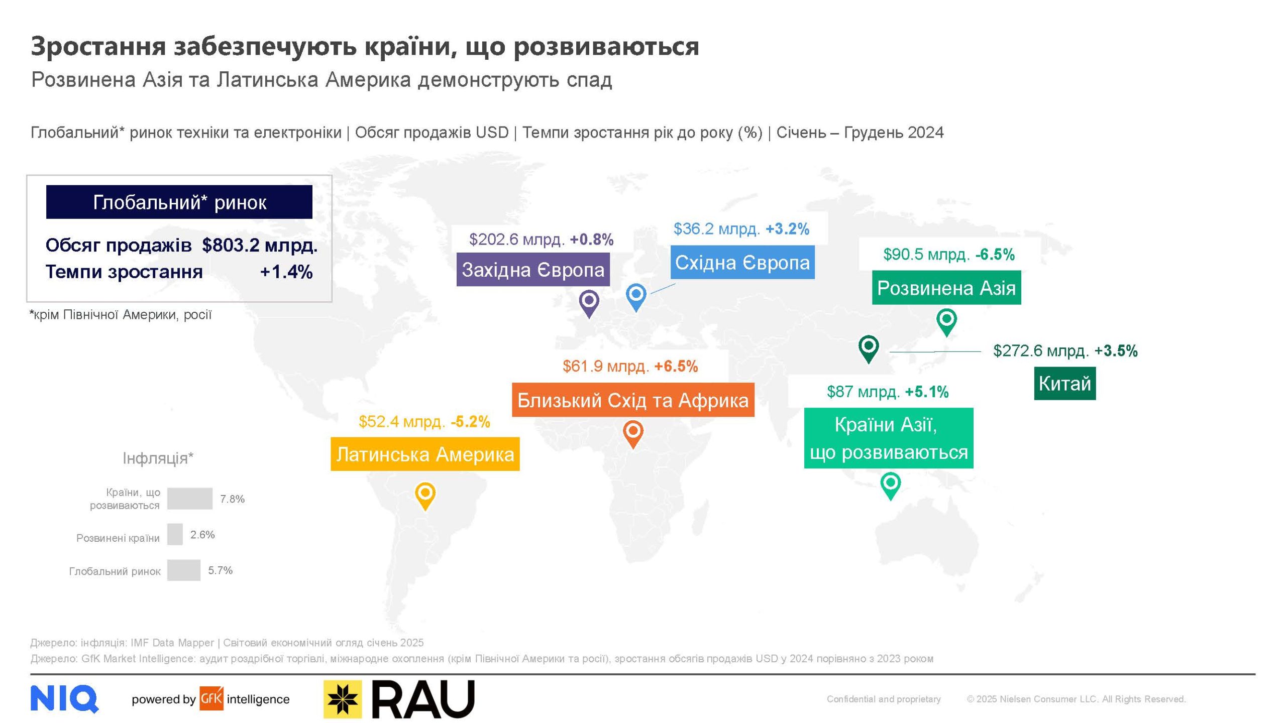 Світовий ринок техніки та електроніки у 2024 році показав зростання на +1.4% в доларах США. Ключовими рушіями зростання стали ринки країн, що розвиваються та Китай, завдяки державній програмі субсидій.