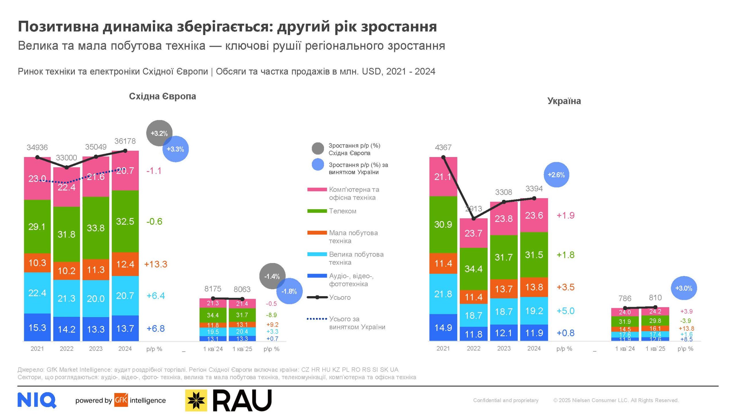 Ринок Східної Європи продовжив зростання цього року та збільшився на +3.2% в доларах порівняно до 2023 року. Україна зростала дещо повільнішими темпами +2.6%, натомість зберігає позитивну динаміку і в першому півріччі 2025 року: +3.0% в грошовму виразі. Ключовими рушіями зростання для регіону та України стали велика та мала побутова техніка.