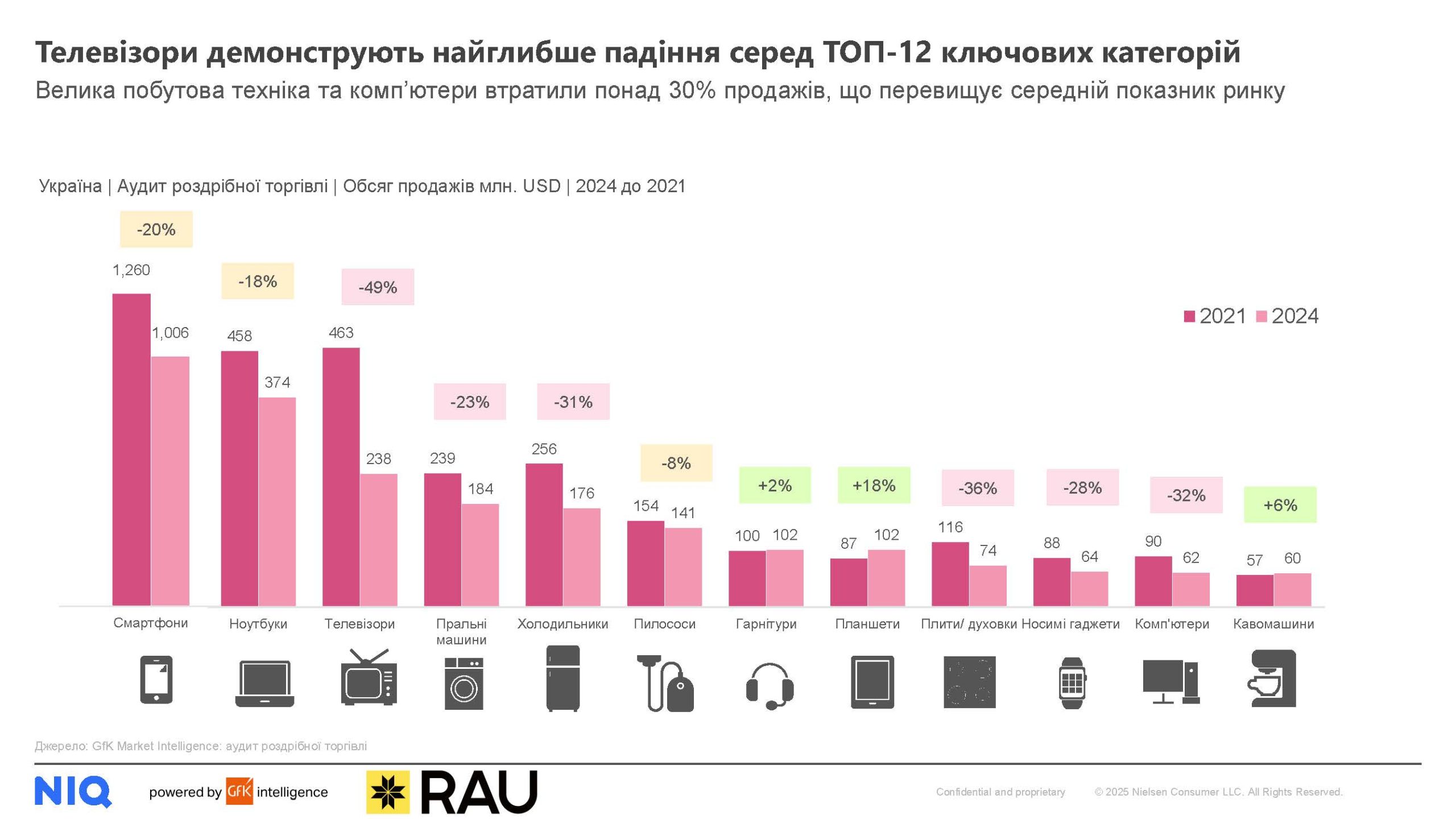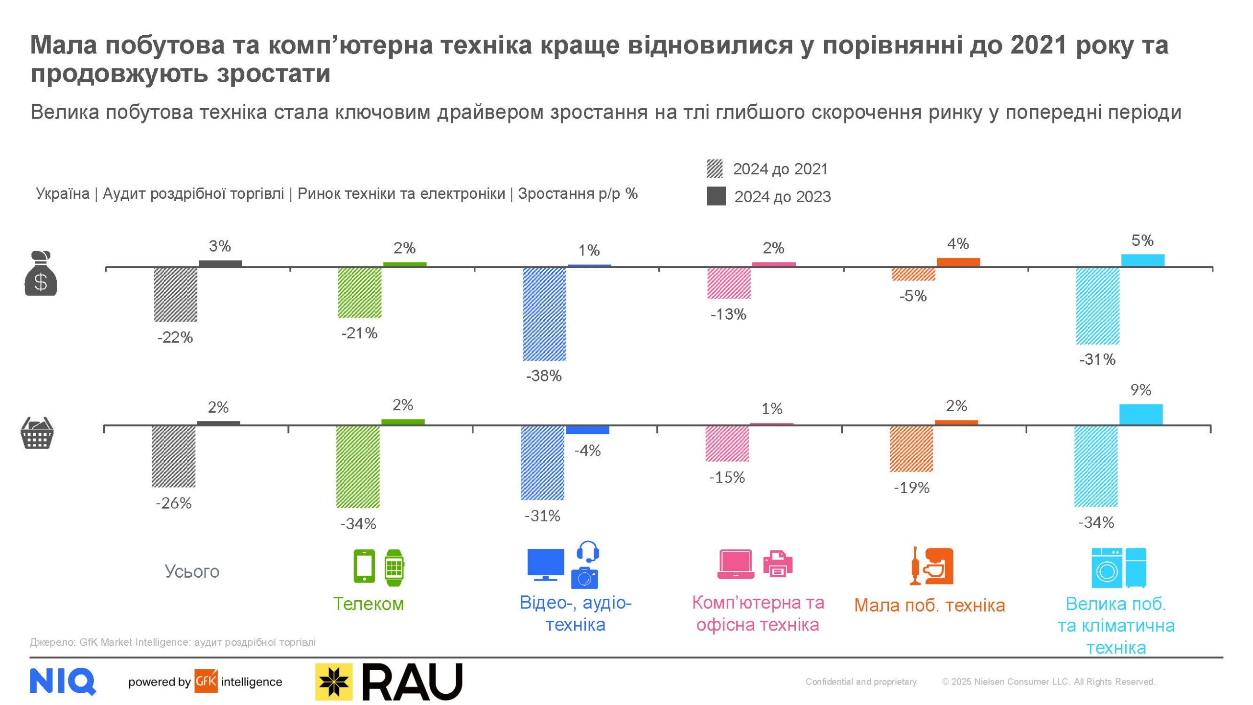 Усі сектори ринку техніки та електроніки показали позитивну динаміку у 2024 році в грошовому виражені. Найшвидшими темпами зростала велика побутова техніка на тлі глибшого падіння у попередніх періодах: +5% у грошовому виразі. Мала побутова та комп’ютерна техніка краще відновилися у порівнянні до 2021 року.
