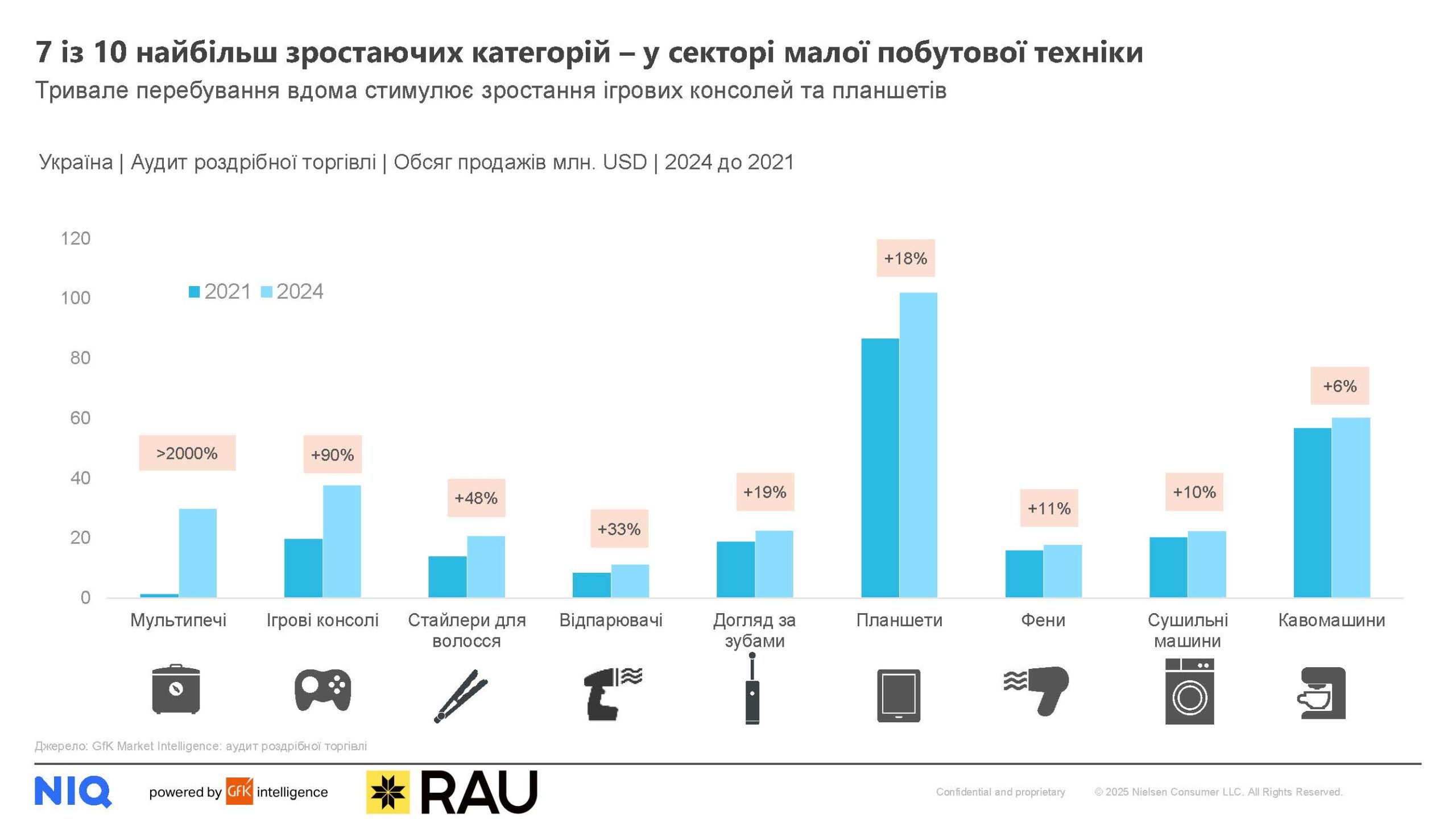 7 з 10 продуктових груп, які продемонстрували найвищі темпи зростання до 2021 року, належать до сектора малої побутової техніки. Ігрові консолі та планшети також потрапили в топ по темпах зростання. Ці товари об’єднують тренди інноваційності та забезпечення комфортного тривалого перебування вдома.