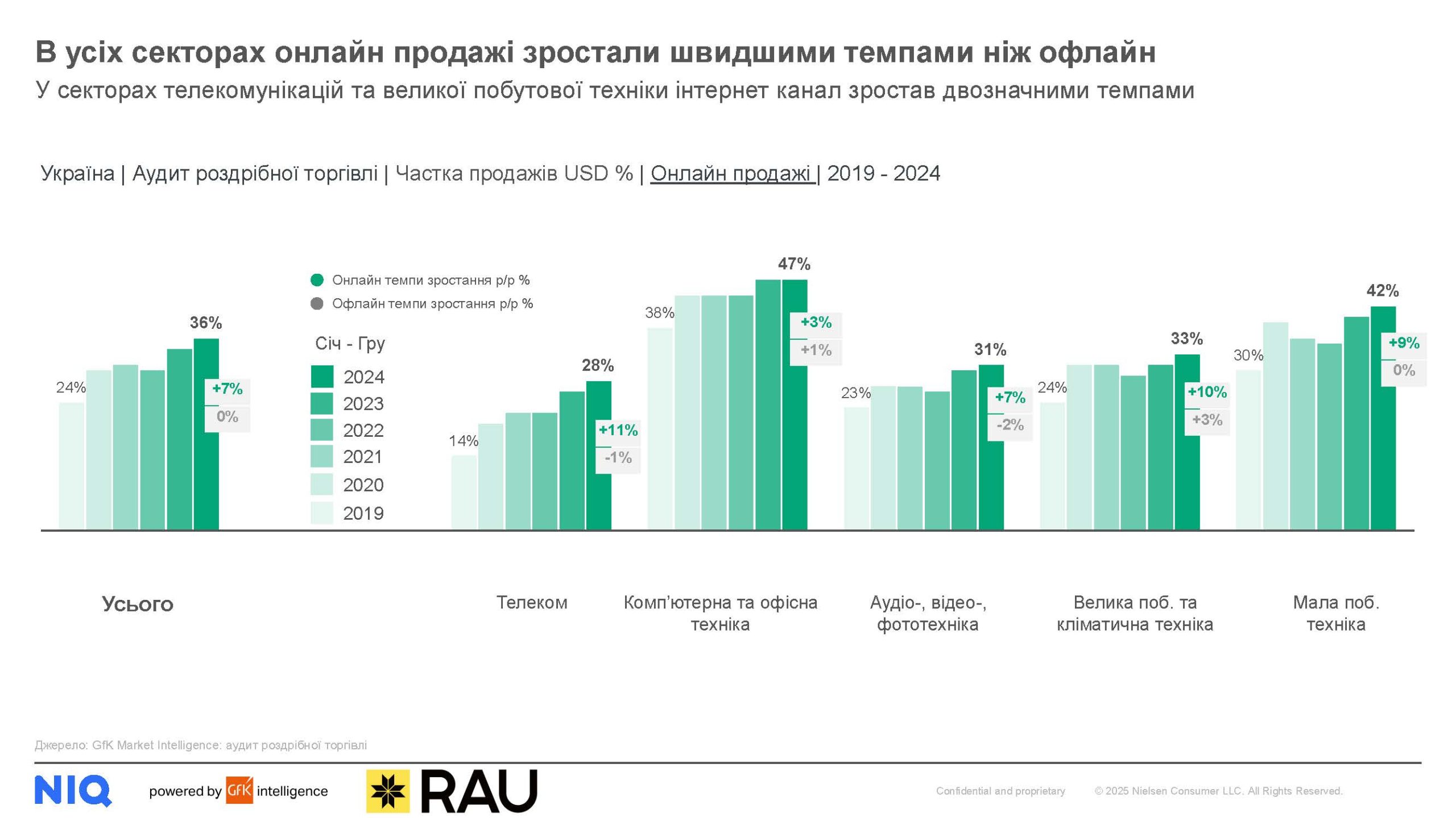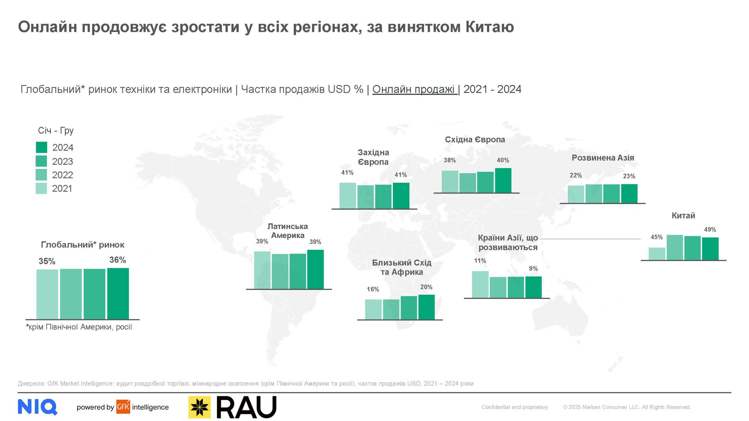 Частка онлайн-продаж продовжує зростати в більшості регіонів світу, зокрема в Східній Європі та Україні. В усіх секторах ринку техніки та електроніки онлайн-продажі продовжили зростати швидше за офлайн.