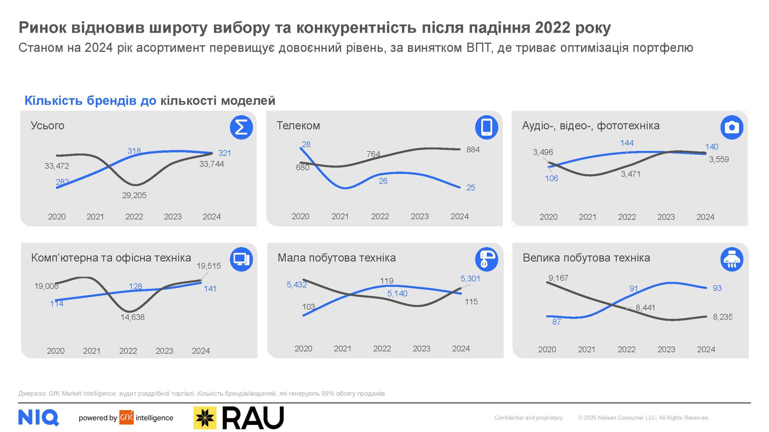 Після суттєвого скорочення ширини асортименту з початком повномасштабного вторгнення на ринку відновилося різномаїття моделей та брендів. Цей тренд актуальний для всіх секторів, крім великої побутової техніки, де спостерігається оптимізація портфоліо виробниками.