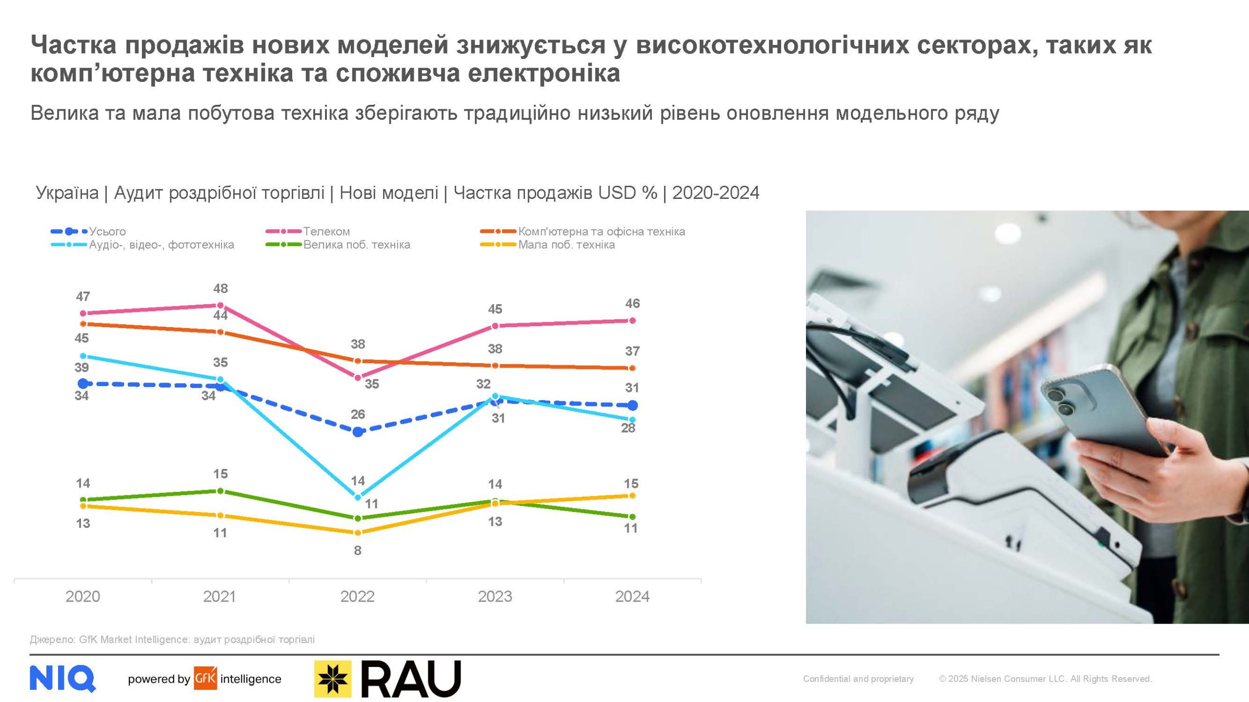 Частка продажів, яку генерують продукти, вперше представлені на ринку у поточному році, дещо скорочується рік до року. Найбільш помітне це скорочення на високотехнологічних ринках комп’ютерної техніки та телевізорів. Традиційно низька частка зберігається на ринках великої та малої побутової техніки за рахунок довшого циклу оновлення у цих категоріях.