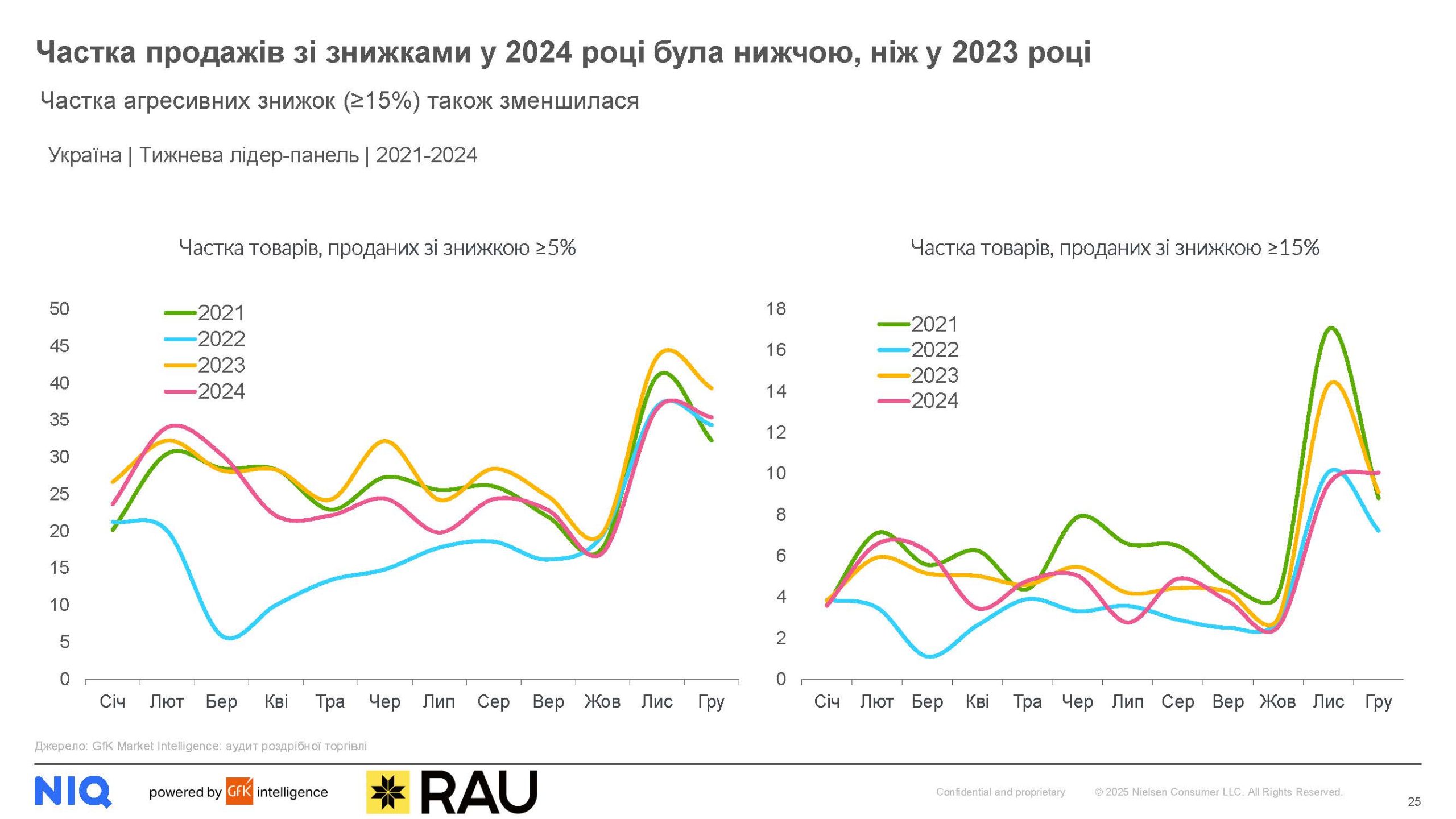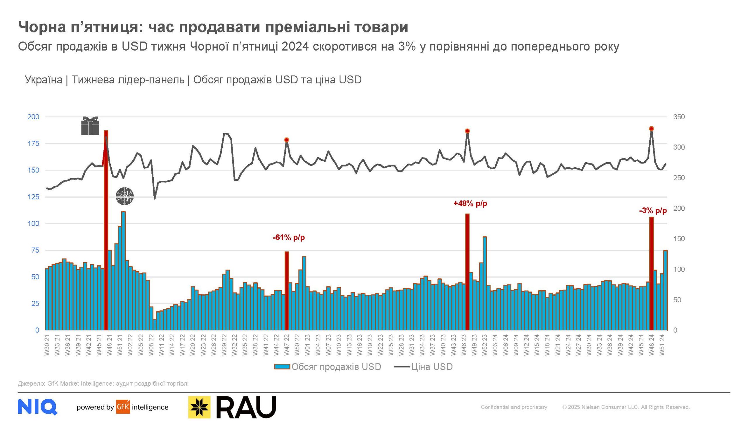 Період листопад-грудень залишається важливим для ринку, генеруючи понад 20% річних продажів. Чорна п’ятниця 2024 року була дещо слабшою за попередній рік і показала -3% у грошовому виражені.
