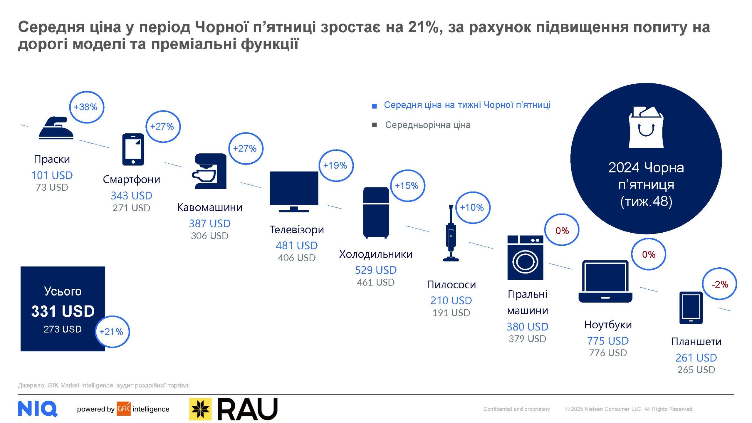 Середня ціна у доларах традиційно зростала на тижні Чорної п’ятниці, за рахунок підвищення попиту на дорогі моделі та преміальні функції. Так, підвищеним попитом користуються товари з цінникомм, вищим за середній по категорії: багатодверні холодильники великих об’ємів, телевізори з технологією OLED та QLED та інноваційні прасувальні системи.