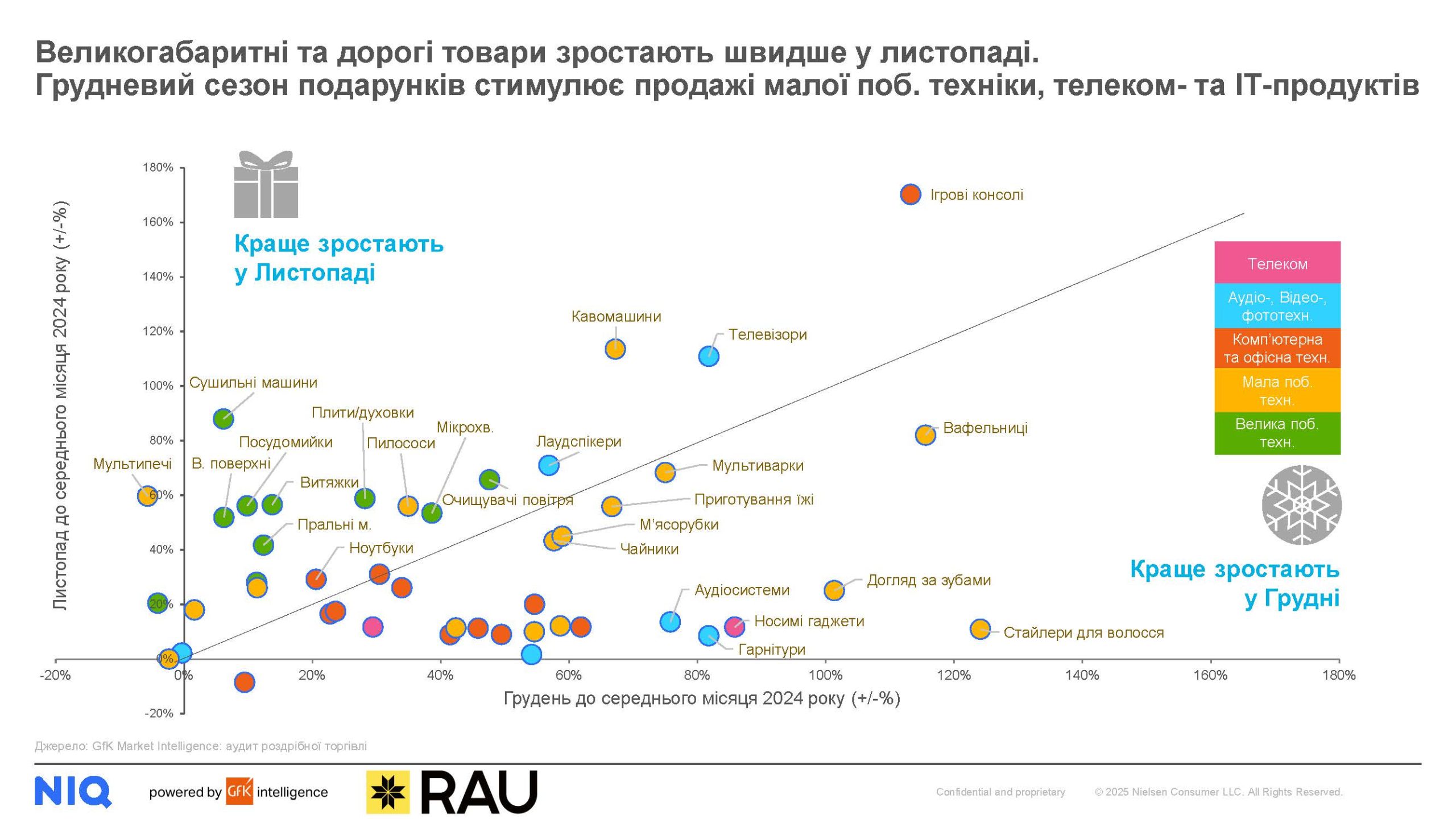 Традиційно листопад та грудень демонструють більший попит на різні категорії товарів. Так у листопаді споживачі охочіше купують габаритну та вартісну техніку для дому, наприклад, телевізори чи велику побутову техніку. Тоді, як сезон подарунків у грудні стимулює попит на товари з категорії малої побутової техніки та невеликі гаджети, такі як розумні годинники та гарнітури.
