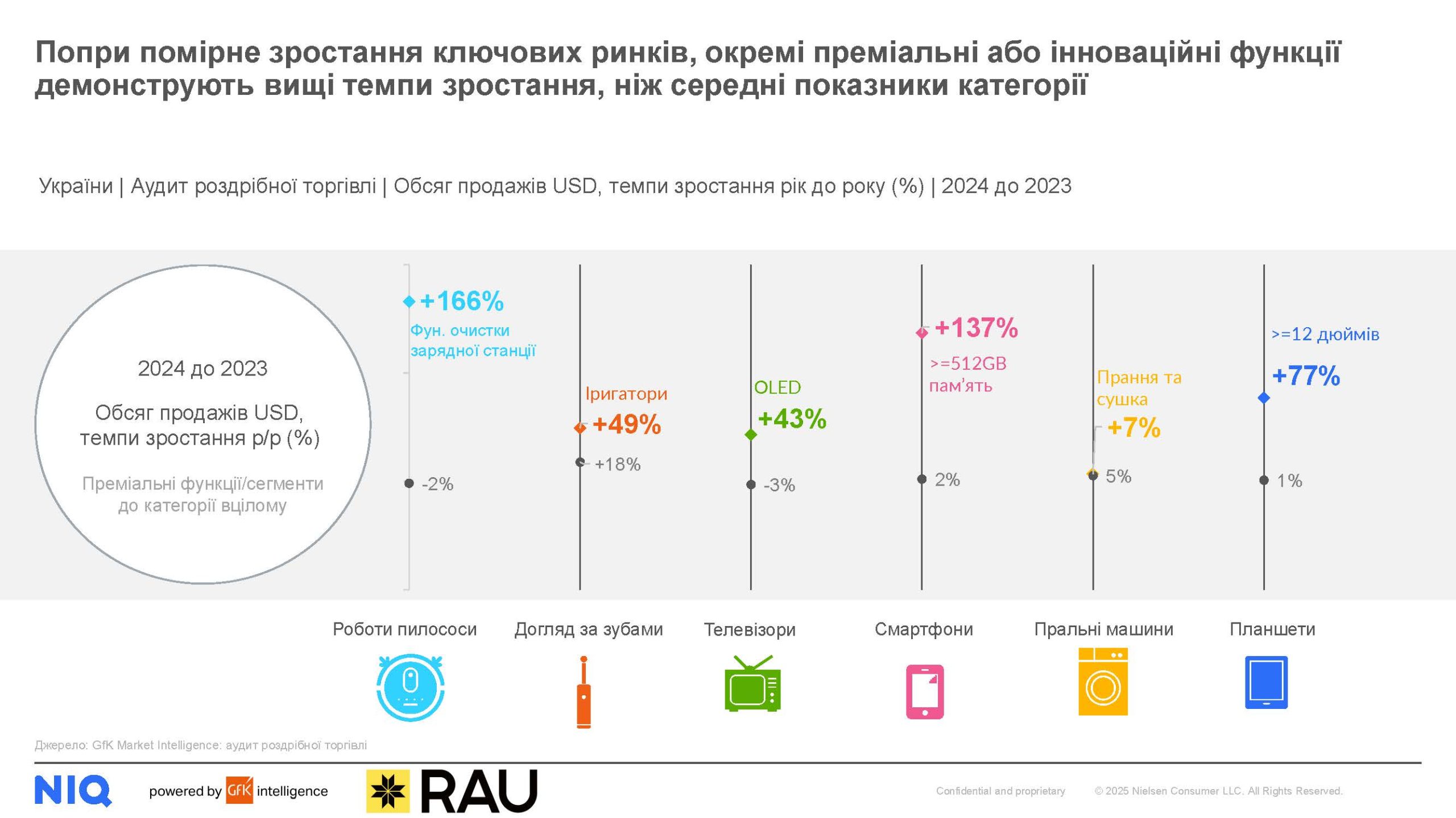 Попри стриману динаміку ринку, економічну нестабільність та загальну невизначеність, українські споживачі не втрачають інтересу до інноваційних рішень і функціональності преміального рівня. Цей тренд простежується у всіх основних категоріях. Зокрема, у сегменті смартфонів спостерігається зростання попиту на моделі з більшим обсягом пам’яті, у категорії планшетів — на пристрої з більшою діагоналлю, а в категорії товарів для дому — на функціональні рішення, як-от роботи-пилососи з функцією самоочищення або пральні машини з інтегрованою сушкою.