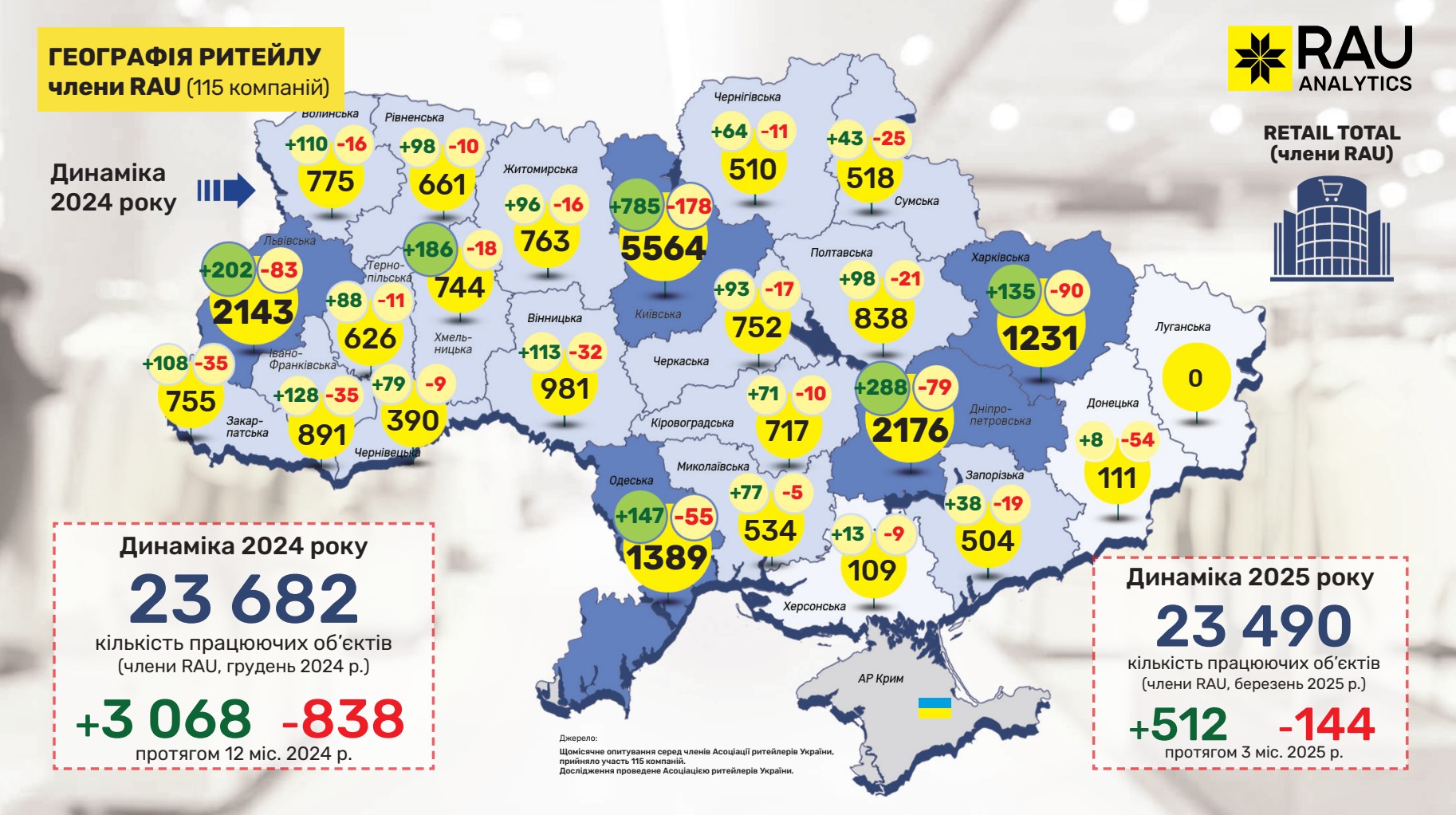 Як показало регулярне щомісячне опитування RAU, проведене серед 115 членів Асоціації ритейлерів, станом на кінець 2024 року в них працювало вже 23 682 торговельних точок. За минулий рік мережі українських ритейлерів розширилися на 3068 магазинів. Це на 14% більше, ніж було у 2023-му. Враховуючи закриття 838 точок, протягом минулого року чистий приріст склав 2230 магазинів. Кількість працюючих магазинів у поточному році продовжує демонструвати позитивну динамку. Так, за січень-березень 2025-го мережі додали ще 512 магазинів, було зачинено з різних причин 144. Відповідно приріст склав 368 торгових об’єктів.