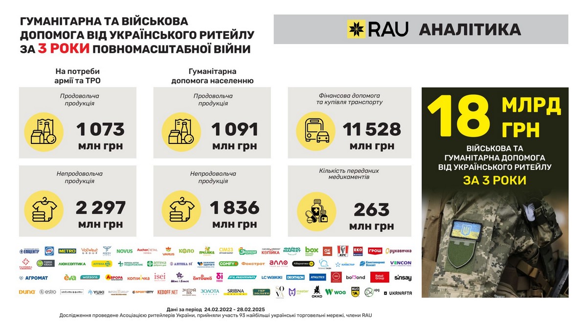 Асоціація ритейлерів України також підрахувала загальну кількість гуманітарної допомоги, що була надана вітчизняним ритейлом за три роки війни. Загалом за період з 24 лютого 2022 року по 28 лютого 2025 року 93 найбільші українські торговельні мережі-члени RAU зібрали та передали допомоги на суму 18 млрд грн.