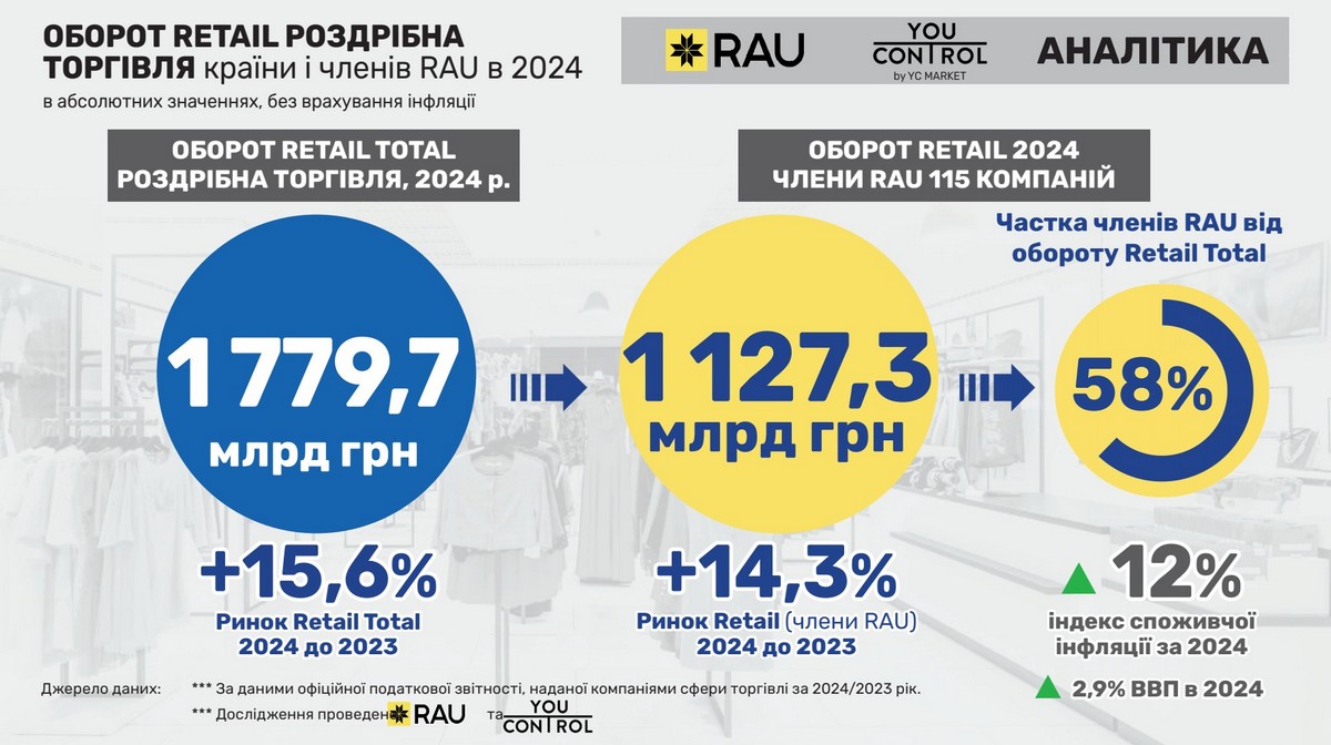Як показують результати дослідження RAU, проведеного спільного з YouControl (продукт YС.Market) по оборотах галузі, минулого року українські ритейлери загалом отримали виторг майже в 1,78 трлн грн. Що в абсолютних цифрах, тобто без урахування впливу інфляції, перевищило показники 2023-го на 15,6%. Власне члени RAU забезпечили 58% від цього обороту, або майже 1,13 трлн грн. Це на 14,3% більше, ніж у 2023 році.