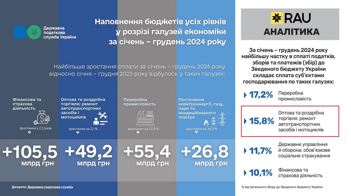 Так, за даними Державної податкової служби, протягом 2024 року находження в розділі оптова та роздрібна торгівля збільшилися на 49,2 млрд грн або на 22% порівняно із 2023-м.