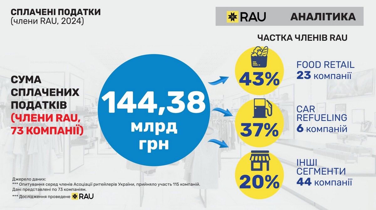 Внесок членів RAU у наповненні бюджету теж є чималим. Так, 73 великі компанії зі 115 опитаних, які є членами RAU, сплатили минулого року 144,38 млрд грн податків. Відповідно, 43% цієї суми сплатили 23 продовольчі мережі. Ще 37% припадає на шість представників паливного ритейлу, а решта – 20% – суми було перераховано до бюджету 44-ма операторами різних сегментів роздрібної торгівлі.