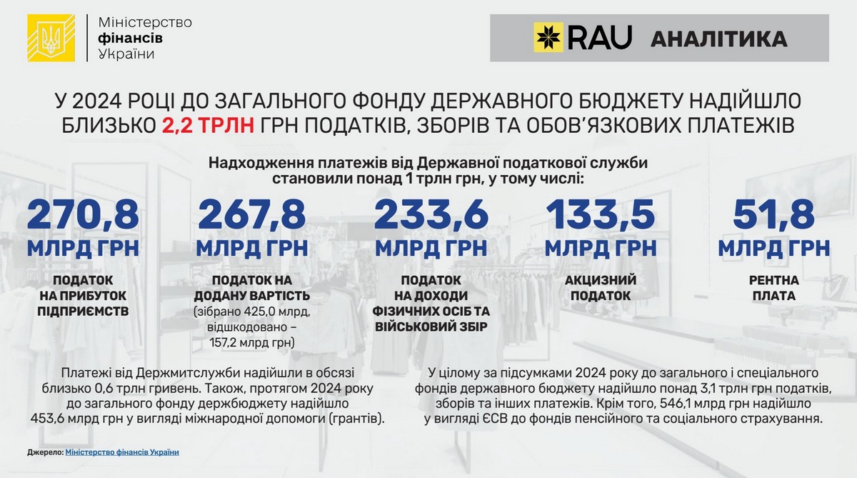 Збільшення оборотів ритейлу прямо впливає на кількість сплачених компаніями податків та фінансову спроможність української держави. За даними Міністерства фінансів України, в 2024 році до загального фонду державного бюджету надійшло близько 2,2 трлн грн податків, зборів та обов’язкових платежів. Власне надходження платежів від Державної податкової служби становили понад 1 трлн грн. Половину цієї суми склади податок на прибуток (270,8 млрд грн) та ПДВ (267,8 млрд грн). Третім за значущістю надходжень є податок на доходи фізичних осіб та військовий збір – 233,6 млрд грн.