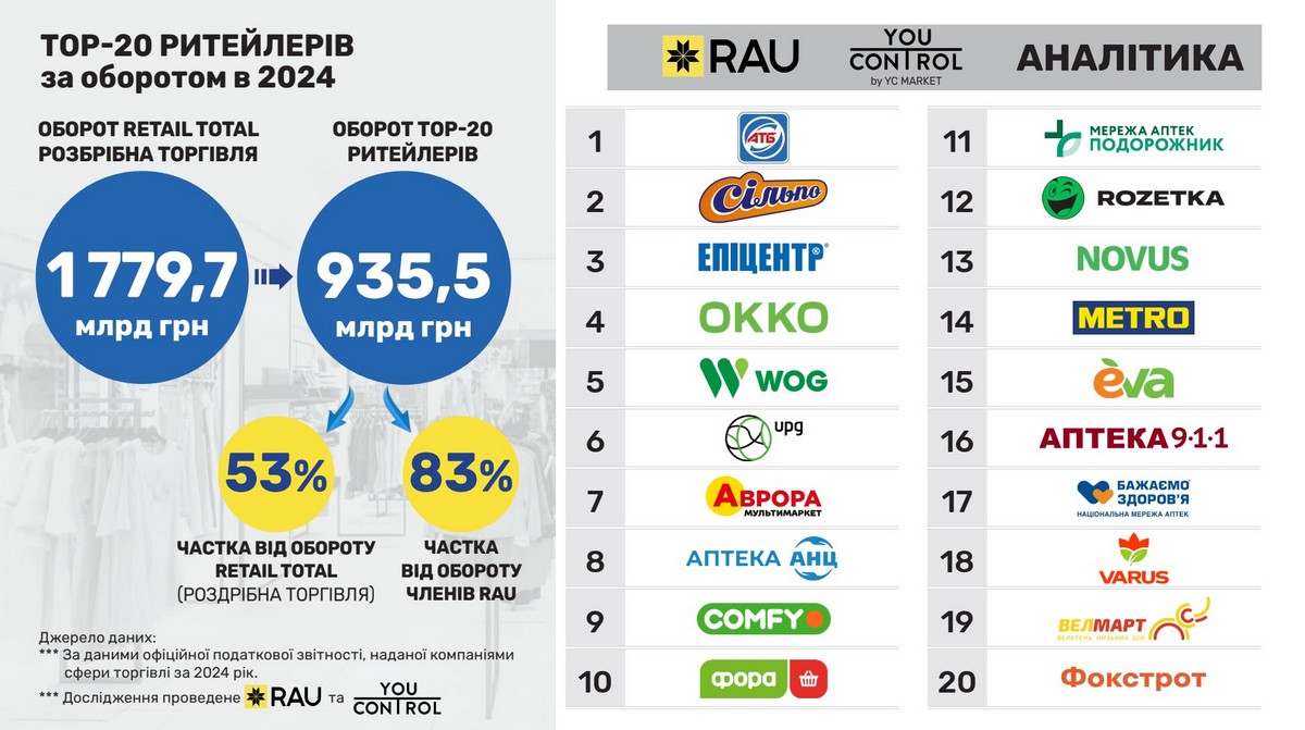 Аби виділити основних гравців, що сприяли зростанню української торгівлі, було визначено топ-20 компаній, чиї обороти виявилися найбільшими. Загалом ці два десятки компаній забезпечили минулого року 53% від обороту галузі або 935,5 млрд грн. Відповідно, на членів RAU припадає 83% в обороті першої двадцятки компаній. Як видно з таблиці, в трійку лідерів входять мережі магазинів АТБ та Сільпо, а також компанія Епіцентр. У топ-5 входять дві мережі АЗК – ОККО та WOG. Компанії було ранжовано за розміром їх оборотів.