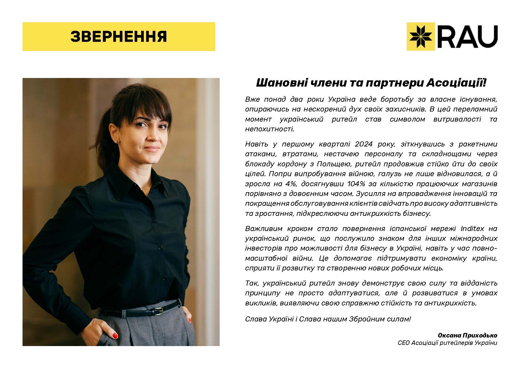 Оксана Приходько, СЕО Асоціації ритейлерів України: «Вже понад два роки Україна веде боротьбу за власне існування, опираючись на нескорений дух своїх захисників. В цей переламний момент український ритейл став символом витривалості та непохитності.