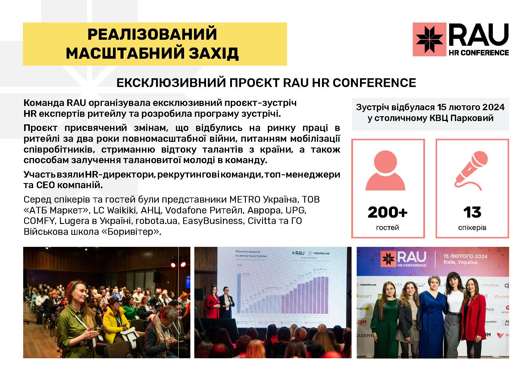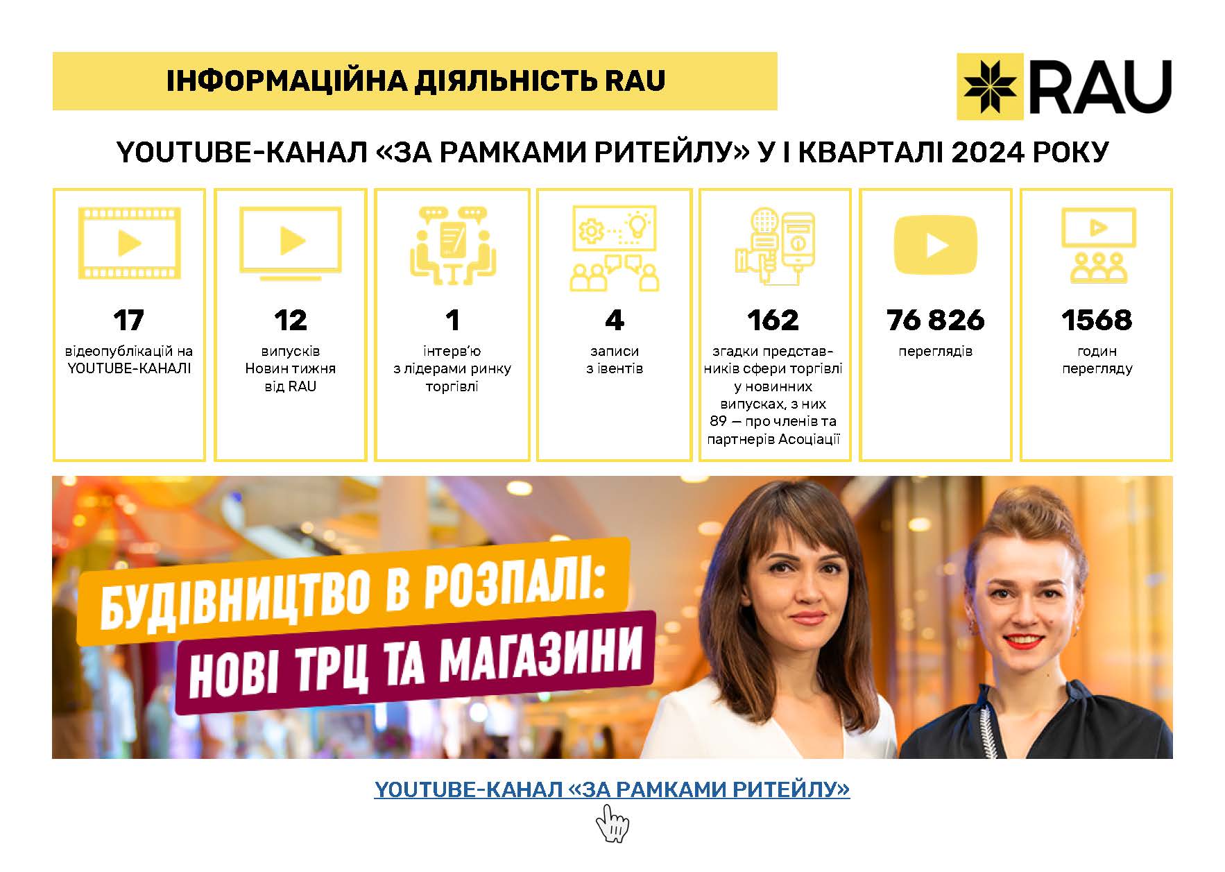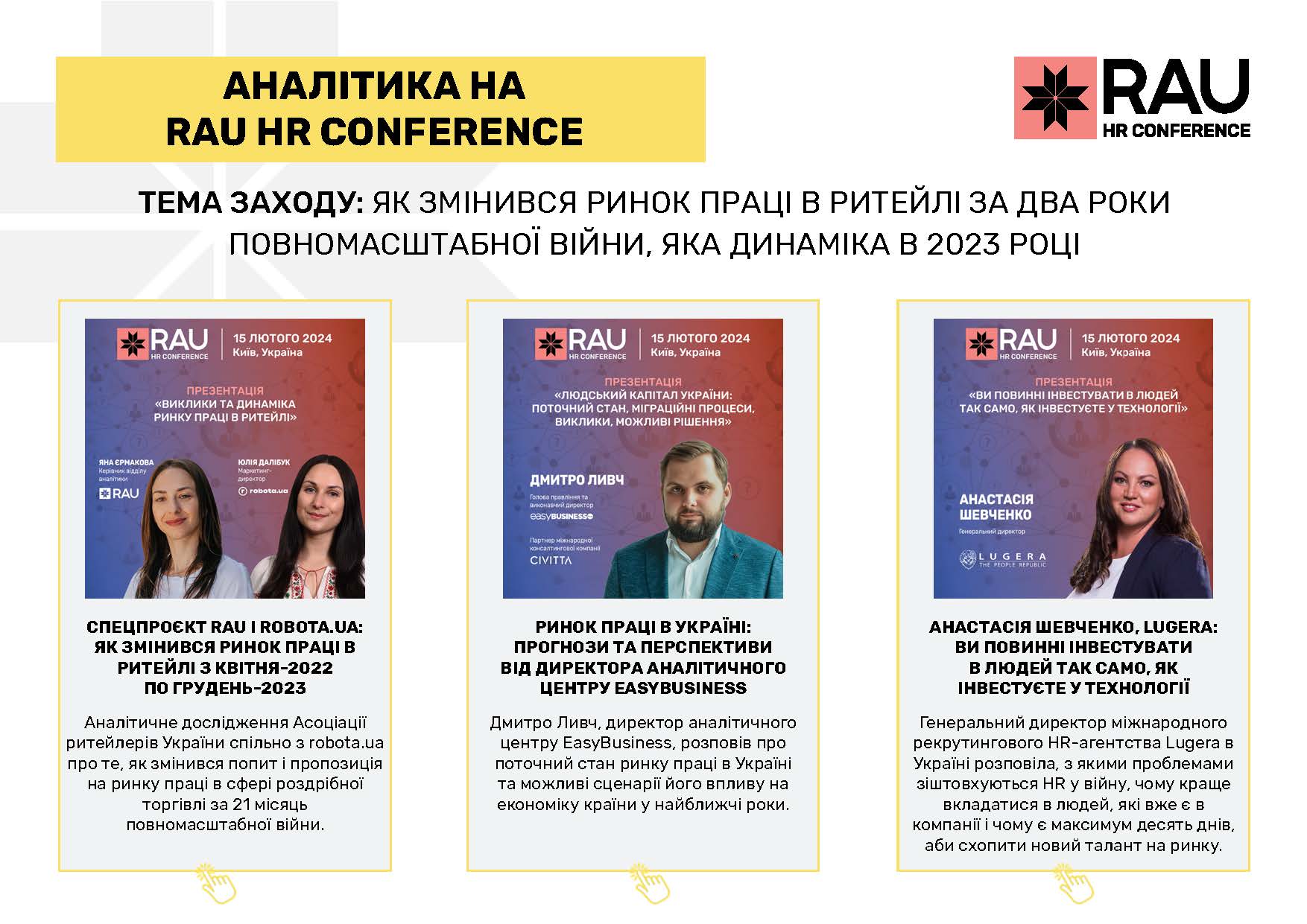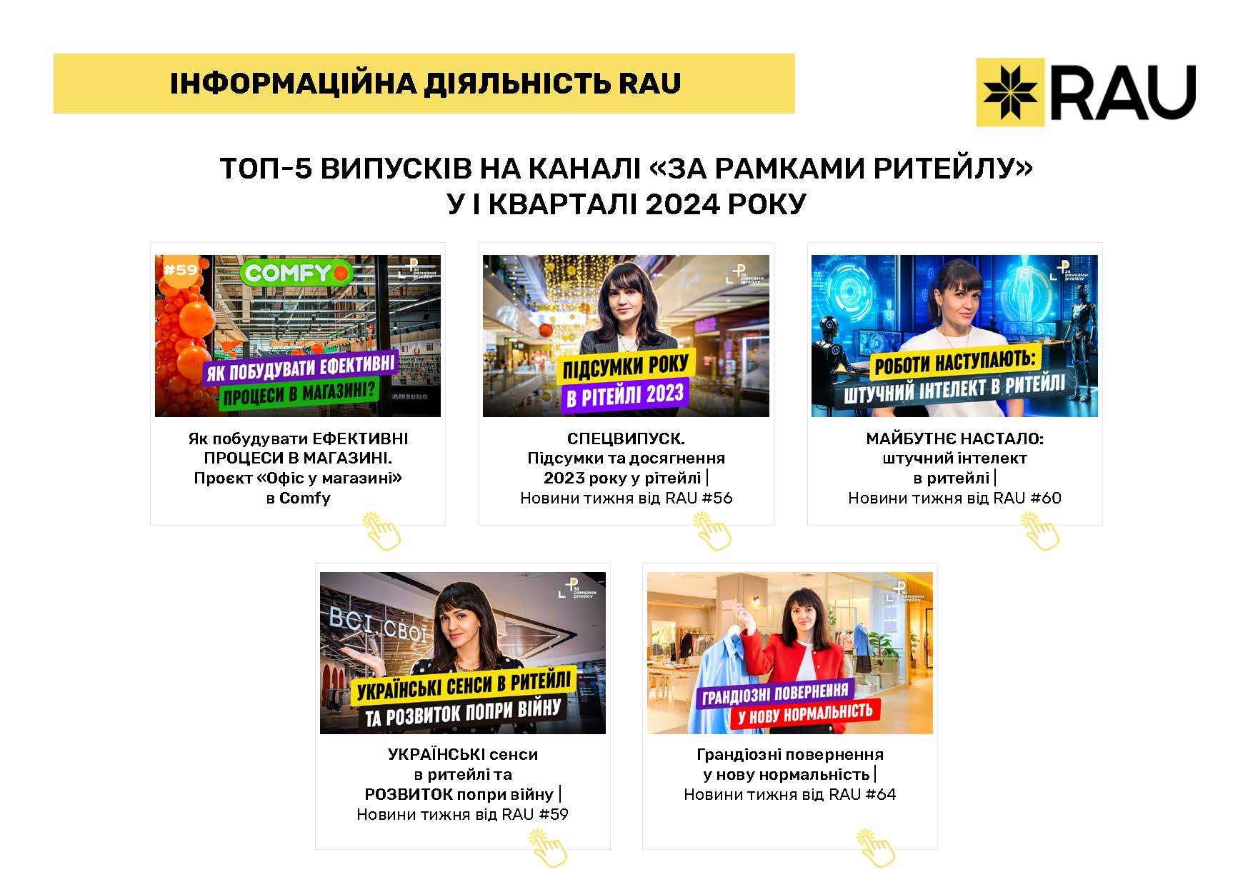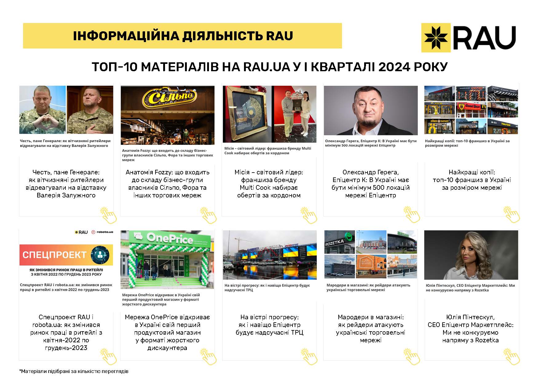 Підсумки роботи Асоціації ритейлерів України у I кварталі 2024 року в цифрах та графіках: які члени та партнери приєднались до RAU, скільки статей було опубліковано, як пройшла перша RAU HR Conference ексклюзивний проєкт-зустріч HR експертів ритейлу, які аналітичні дослідження вдалося реалізувати, які зустрічі з владою організувала GR-команда, що було зроблено та які результати отримано.