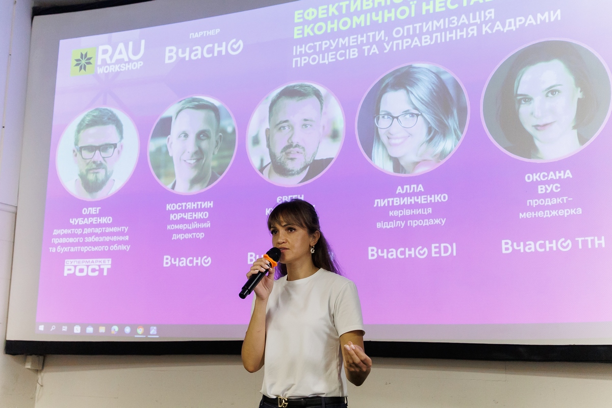Обговорення та активний обмін досвідом продовжувалися до самого початку другої частини, яку відкрили директор департаменту правового забезпечення та бухгалтерського обліку мережі магазинів Рост Олег Чубаренко, та керівниця відділу продажу “Вчасно.EDI” Алла Литвинченко. Тема їх презентації: “Як зменшити помилки та збільшити ефективність процесів, коли ваші ресурси обмежені”.
