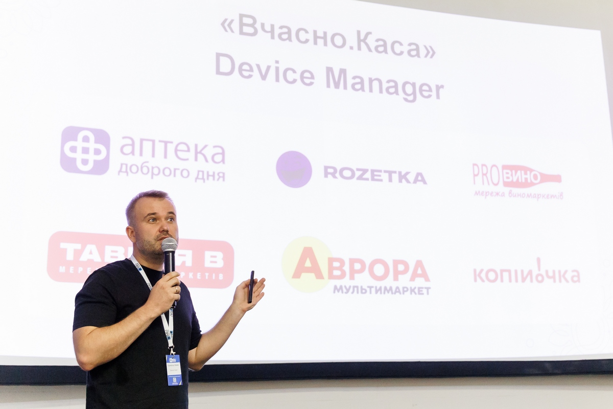 Наступним спікером став керівник “Вчасно.Каса” Євген Кушнірчук, який в своїй презентації під назвою “Недостатність кадрових ресурсів як стимул для розробки нових рішень” на прикладах торгових мереж показав, як можна винаходити нові підходи до стандартних процесів. А також розповів про те, як кадровий голод виступає “драйвером” інновацій та оптимізації процесів. Зокрема, про те, що для мережі з 2000 касових апаратів наразі просто не знайти необхідної кількості айтівців. Відповідно, ефективним рішенням є система централізованого керування касами.