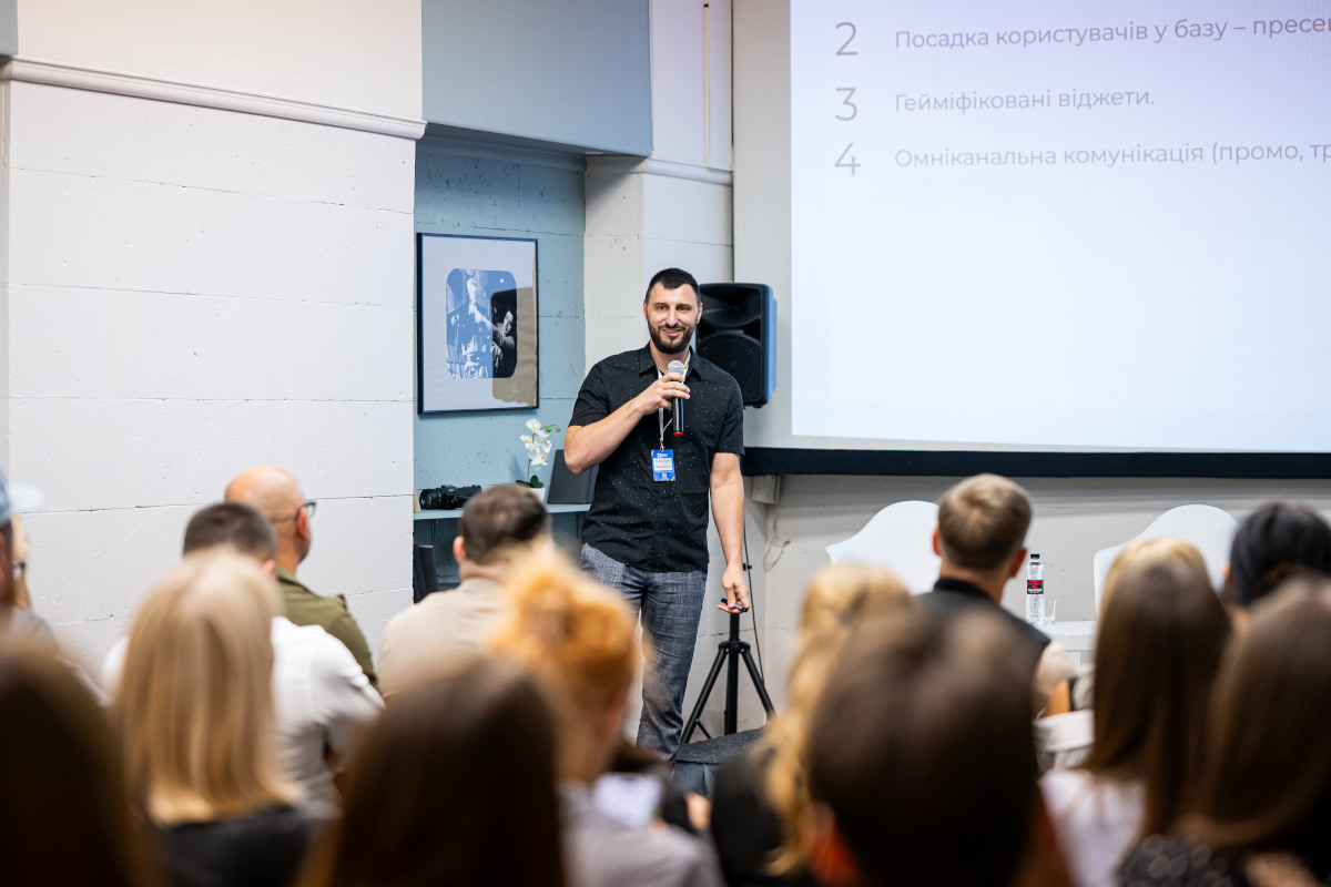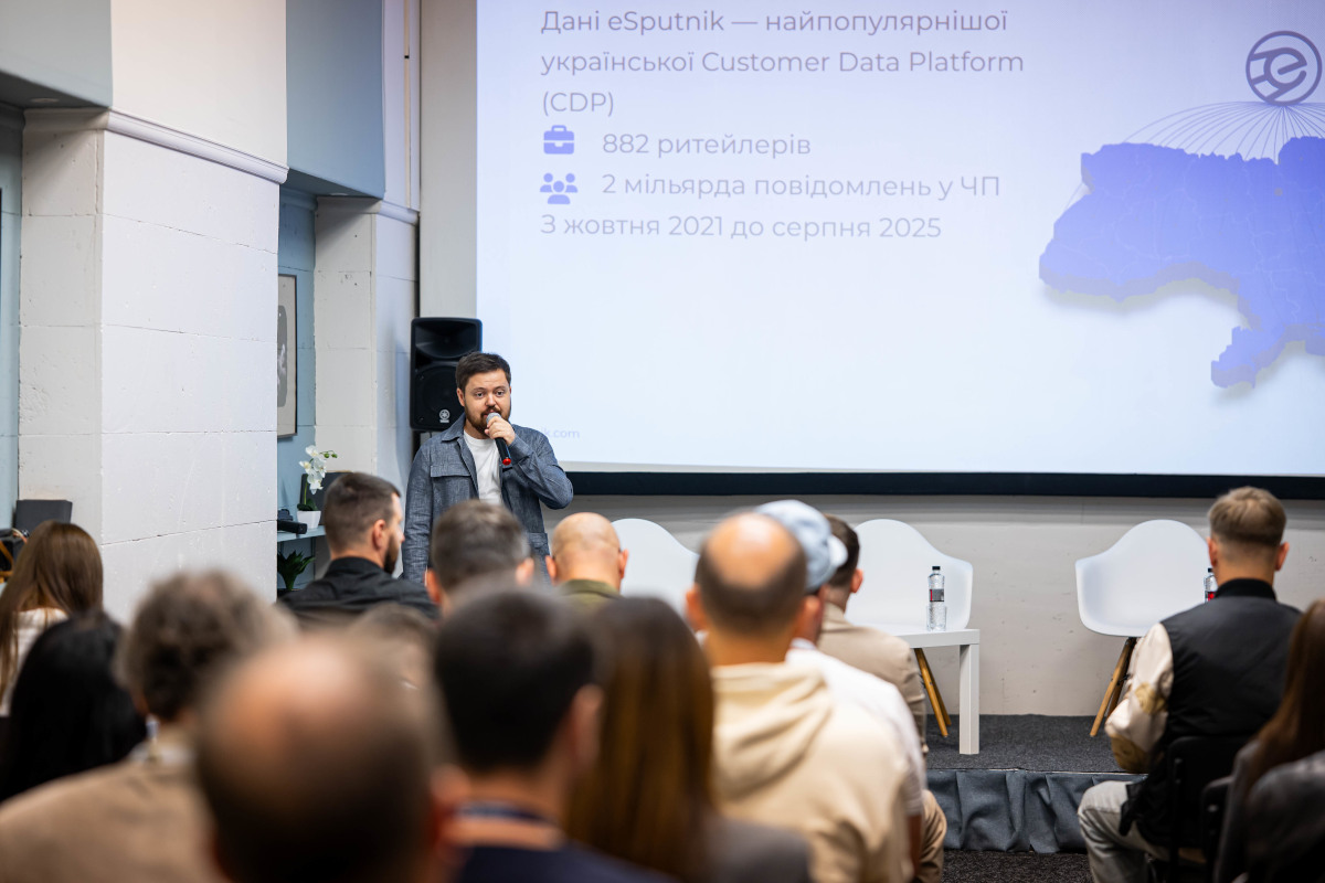 Першим виступив Олег Лєсов, CDP eSputnik з презентацією «Shopping Season is Coming. Як змінюються показники бізнесу під час сезонних розпродажів». На основі даних за останні п’ять років спікер показав, як Чорна п’ятниця впливає на продажі, середній чек та структуру нових і постійних клієнтів, а також які канали дають найвищу конверсію, як нові канали вриваються у тренди та що робити для подальшого зростання.