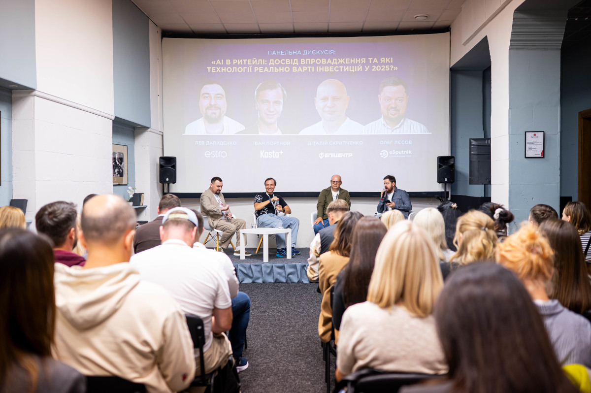 Далі захід продовжився панельною дискусією на тему «AI в ритейлі: досвід впровадження та які технології реально варті інвестицій у 2025», в якій взяли участь Лев Давиденко, керівник онлайн-напрямку мережі Estro Україна, Іван Портной, Сhief of strategy Kasta, Віталій Скрипченко, омніканальний директор Епіцентр К та модератор Олег Лєсов, CDP eSputnik.