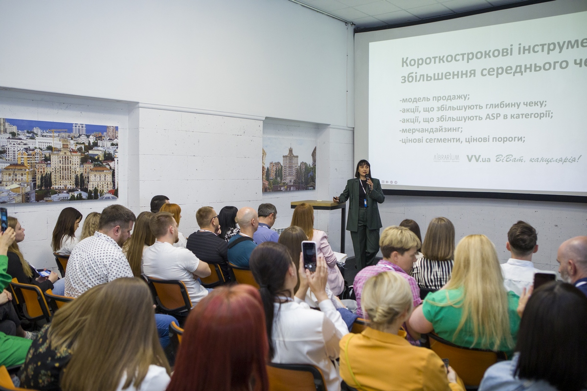 Наступною взяла слово керівник комерційного департаменту мережі магазинів Librarium і ВіВат, канцелярія! Оксана Саква. Темою її виступу стала презентація на актуальну нині тему «Інструменти збільшення середнього чеку», яка базувалася на конкретних кейсах мережі магазинів Librarium. Зокрема, як можна використовувати емоційні покупки товарів, які нібито «не вписуються» в звичний асортимент, а також показала на конкретних прикладах можливості, які надає правильно вибудована програма лояльності. Також вона вперше поділилася досвідом тестування різних форматів магазинів в одній локації та методами підвищення продажів, які довели свою ефективність. Окремо спікер показала відмінність між середнім чеком звичайного покупця та чеком людини, лояльної до бренду.
