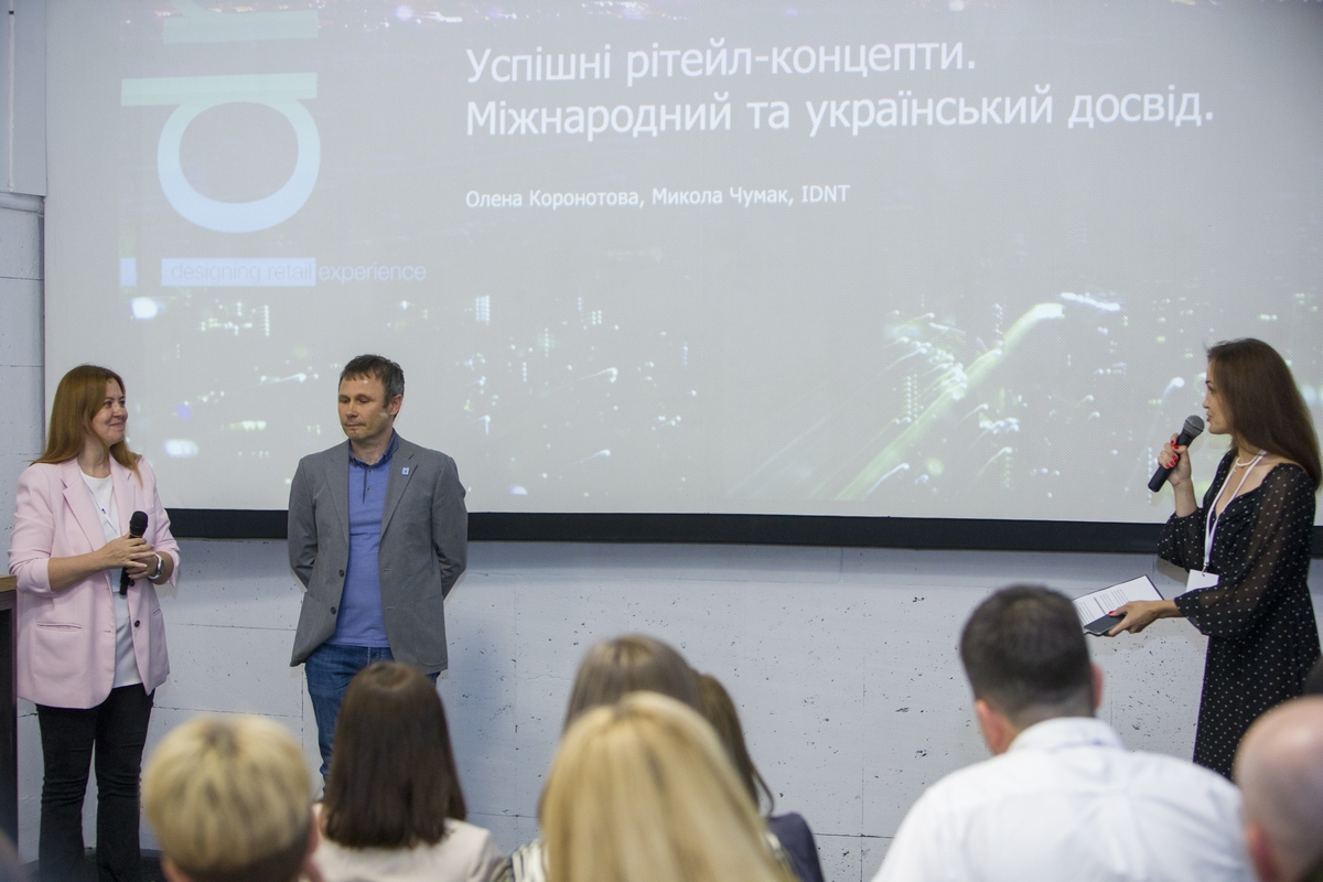 Наступною слово взяла співвласниця та керуючий партнер IDNT Олена Коронотова, яка разом із засновником і CEO IDNT Миколою Чумаком представили учасникам заходу виступ на тему “Успішні рітейл-концепти. Міжнародний та український досвід”. Зокрема, у своєму виступі Олена Коронотова зосередилася на прикладах сучасних трендів рітейл-дизайну в світі (особливу увагу звернувши на важливість освітлення в торговому залі в різний час), а також як розвиваються різні формати та новації в світі. Наприклад, з’ясувалося, що роботи, яким пророчили світле майбутнє, так і не знайшли широкого застосування в сфері обслуговування клієнтів (так звані meeter-greeter). Натомість роботи добре закріпилися в сфері логістики та dark stores.