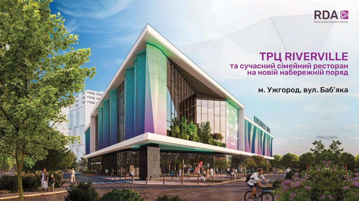 ТРЦ Riverville, м. Ужгород, вул. Баб’яка. Цей новий триповерховий ТРЦ на 19 700 кв. м (без урахування підземного паркінгу ще на 11 200 кв. м) планується в єдиному ансамблі реконструкції міської набережної в Ужгороді вздовж річки Уж. Поряд – територія ЖК Riverville. Термін здачі планується на 2027 рік. Тут також буде ДРЦ на 3000 кв. м, сучасний сімейний ресторан та кінотеатр чи спортивний комплекс (перемовини з потенційними орендарями ще тривають).