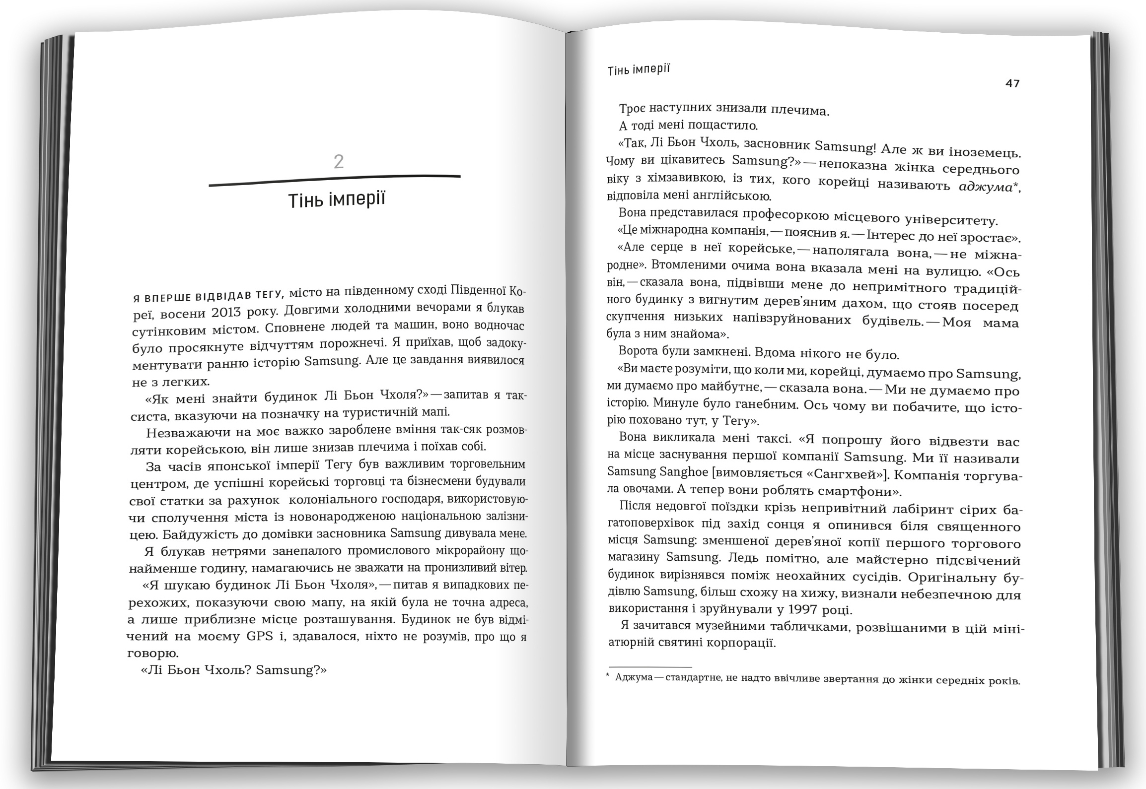 Але книга лише на перший погляд критична. Автор з увагою ставиться до деталей, намагаючись показати Samsung і як амбітного інноватора, і як окрему республіку всередині країни зі своїми суперечностями, політичними скандалами та корупційними баталіями. Всі вони розбиті численними іменами, датами, термінами, паролями та явками так, ніби це послідовна хроніка перетворення продавця овочів і сушеної риби в один з головних технологічних конгломератів планети. Але й тут не все так однозначно, адже корпорація так і не вилізла зі скандалів та внутрішніх протистоянь, тож епілог – без щасливого геппі-енду.