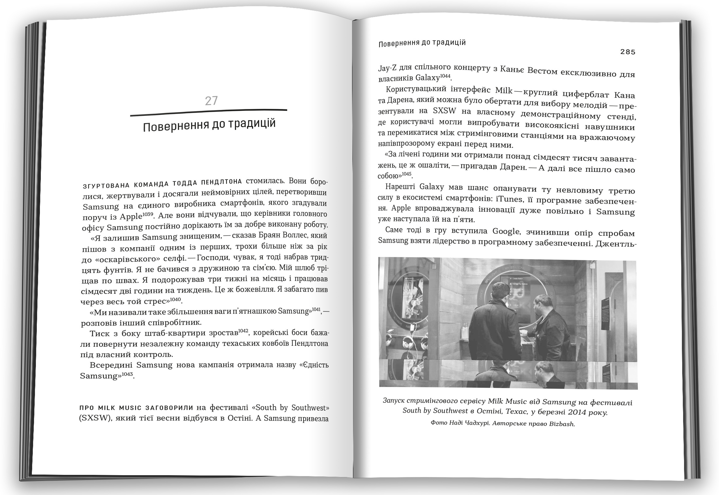 Проте головне у книзі – це найбільш повний літопис війни між Apple і Samsung. Книга просякнута їх протистоянням від початку до самого кінця, починаючи з висміювання Стівом Джобсом габаритів Note Edge закінчуючи їх співпрацею і судовими позовами.