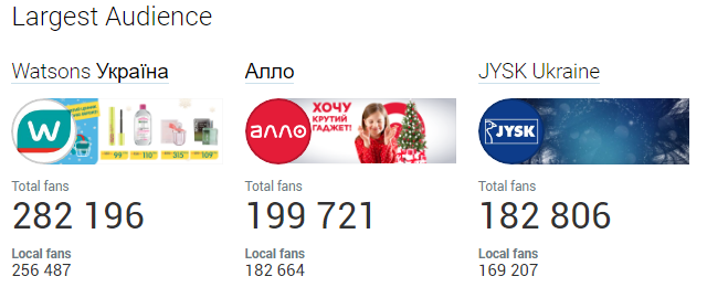 Про не менший успіх можна говорити також щодо мережі магазинів електроніки Алло. В останні місяці рітейлер входив до п’ятірки найбільш швидко зростаючих сторінок Facebook. Підсумком для компанії стало заслужене друге місце в загальному рейтингу і звання найдинамічнішої official page по зростанню шанувальників.