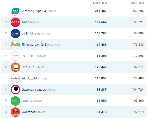 Буквально по п’ятах за ним йде Лінія магазинів EVA, чия кількість українських шанувальників вже перевищила 167 000 чоловік. У новому 2018 році рітейлеру у трійці лідерів вже точно бути.