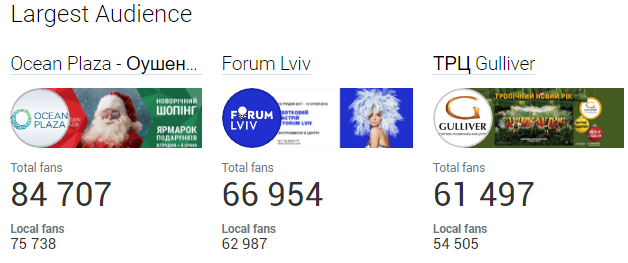 Історія українських ТРЦ в цьому році в Facebook не менш драматична. Як і у випадку з рітейлерами, в топ-3 незмінним залишився лише лідер і в даному випадку це Ocean Plaza з майже 85 000 шанувальників. Цікаво, що за рік торговий центр зріс всього на 20 000 нових фанів у Facebook, що було б незначним для рітейлерів з їх агресивними SMM-кампаніями, але виявилося більше, ніж достатньо для українських ТРЦ. Принаймні у минулому році.