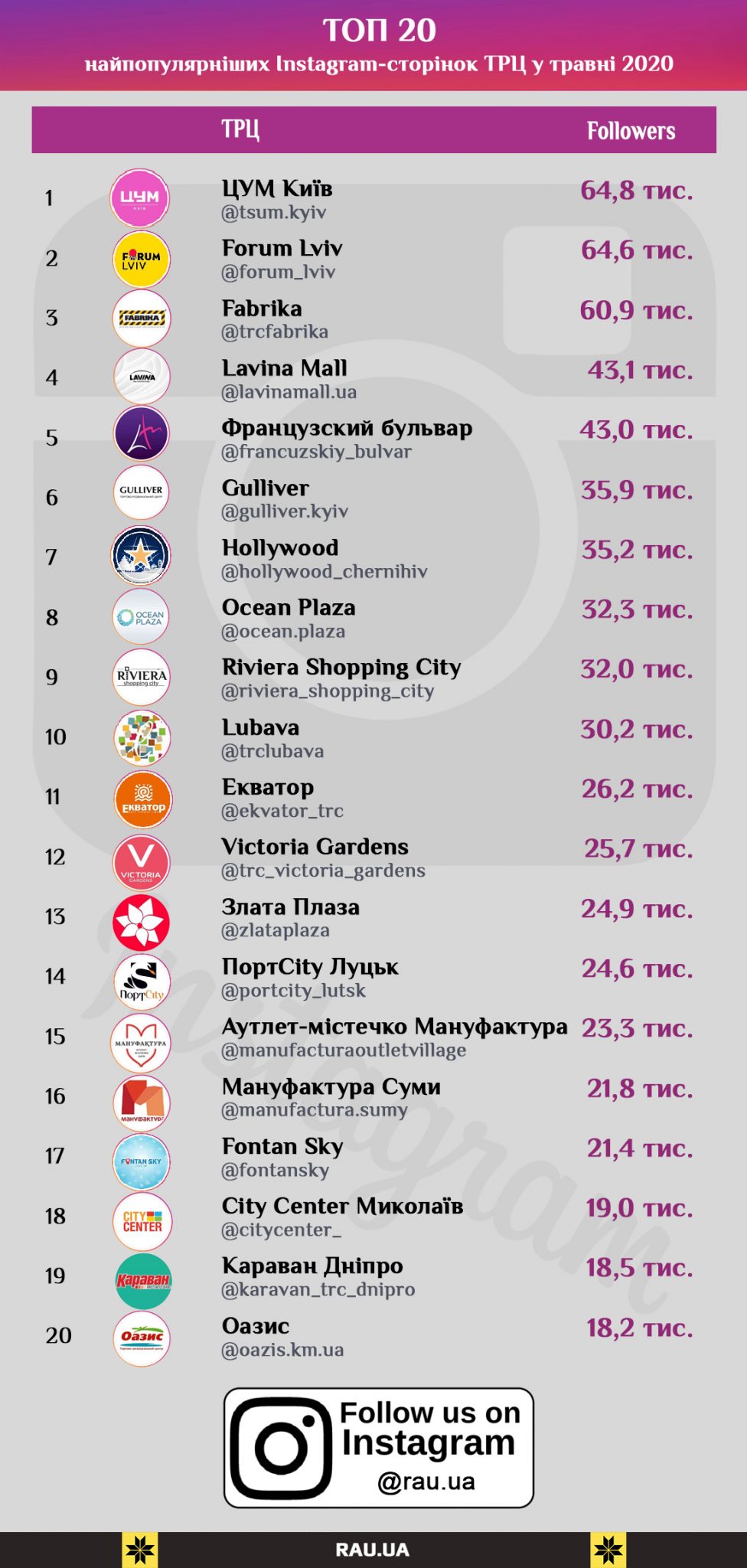 Топ – 20 торгово-розважальних центрів стартує відразу з грандіозних змін – ЦУМ Київ обійшов постійного лідера – Forum Lviv – і посів перше місце рейтингу. Тепер головне – закріпитися, з дистанцією в 200 фоловерів все ще велике питання хто буде лідером.