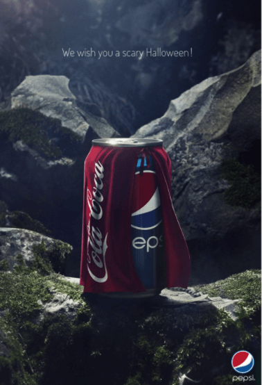 У рекламі Pepsi до Гелловіна банка бренду була одягнена в плащ з лого Coca-Cola, що передавало грайливе, але конкурентне повідомлення. Ця реклама символізувала тривалу сутичку між виробниками газованих напоїв, підкреслюючи ефективність гумору в залученні споживачів і викликаючи бурхливі обговорення.