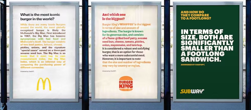 Використання Burger King штучного інтелекту для оскарження твердження McDonald’s про «найбільш культовий бургер» є прикладом використання гумору в рекламі фаст-фуд, підкреслюючи швидку адаптивність і дотепність брендів. Однак Subway скористався нагодою, щоб представити власний варіант ChatGPT, який вивів їх на перше місце в битві сендвічів.