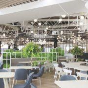 Фуд-корт розроблений так, щоб клієнту хотілося провести тут час. Поки батьки відпочивають, діти можуть поїсти в дитячій зоні, а також пограти, так як тут же буде обладнаний міні-майданчик.