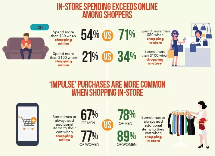 Дослідження First Insight показало, що 71% покупців витрачають у фізичних магазинах $50 і більше, в інтернеті ту саму суму витрачають лише 54% респондентів. У той же час представники покоління зумерів віддають перевагу фізичним магазинам онлайн-покупкам, керуючись можливістю випробувати унікальний досвід при самостійному вивченні асортименту.